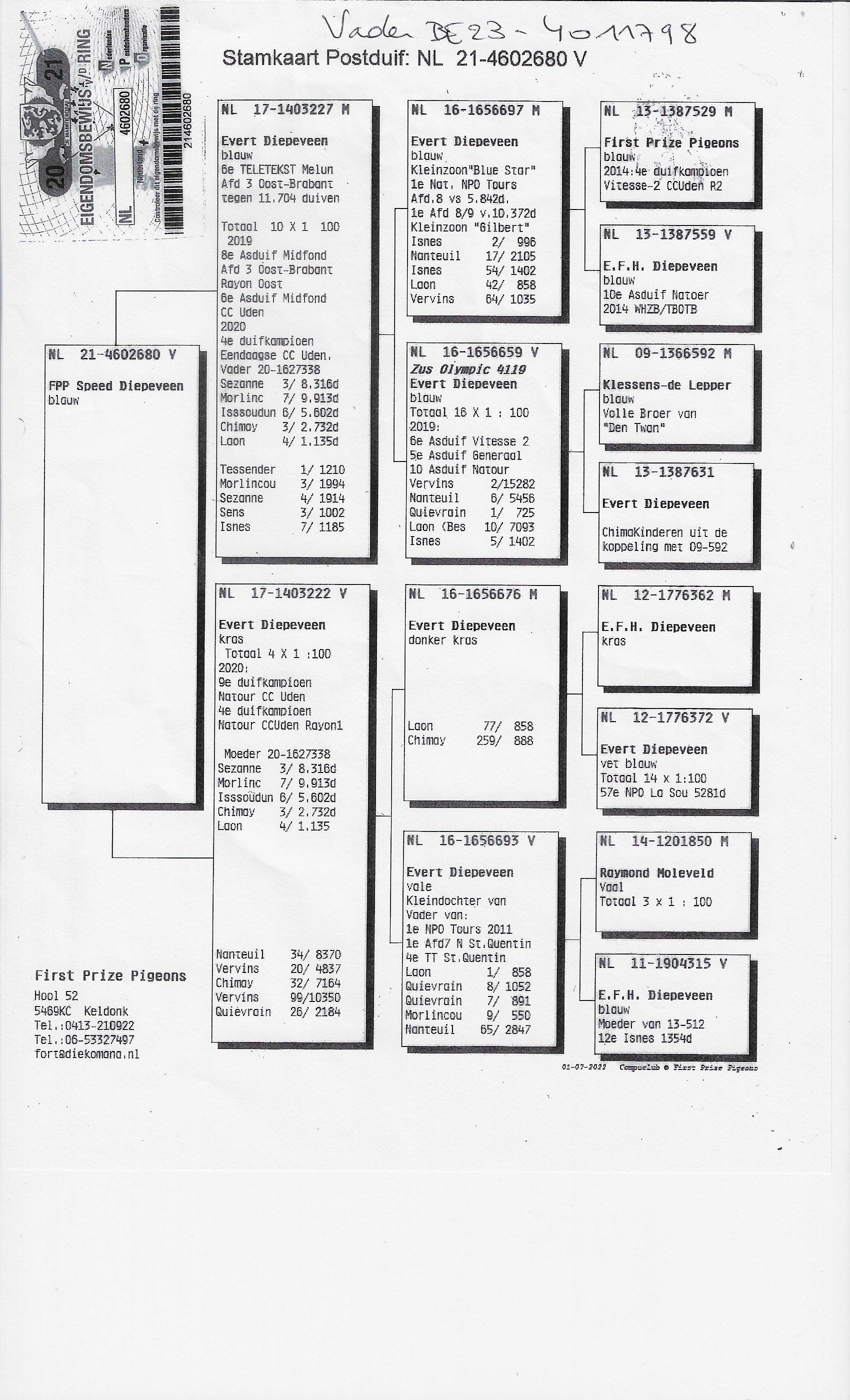 A top-class pigeon from the Remco line (1st Nat. Cahors) and multiple national ace pigeons – proven long-distance ability. The father’s side contributes strong winners with top rankings; a unique opportunity to strengthen any breeding loft.