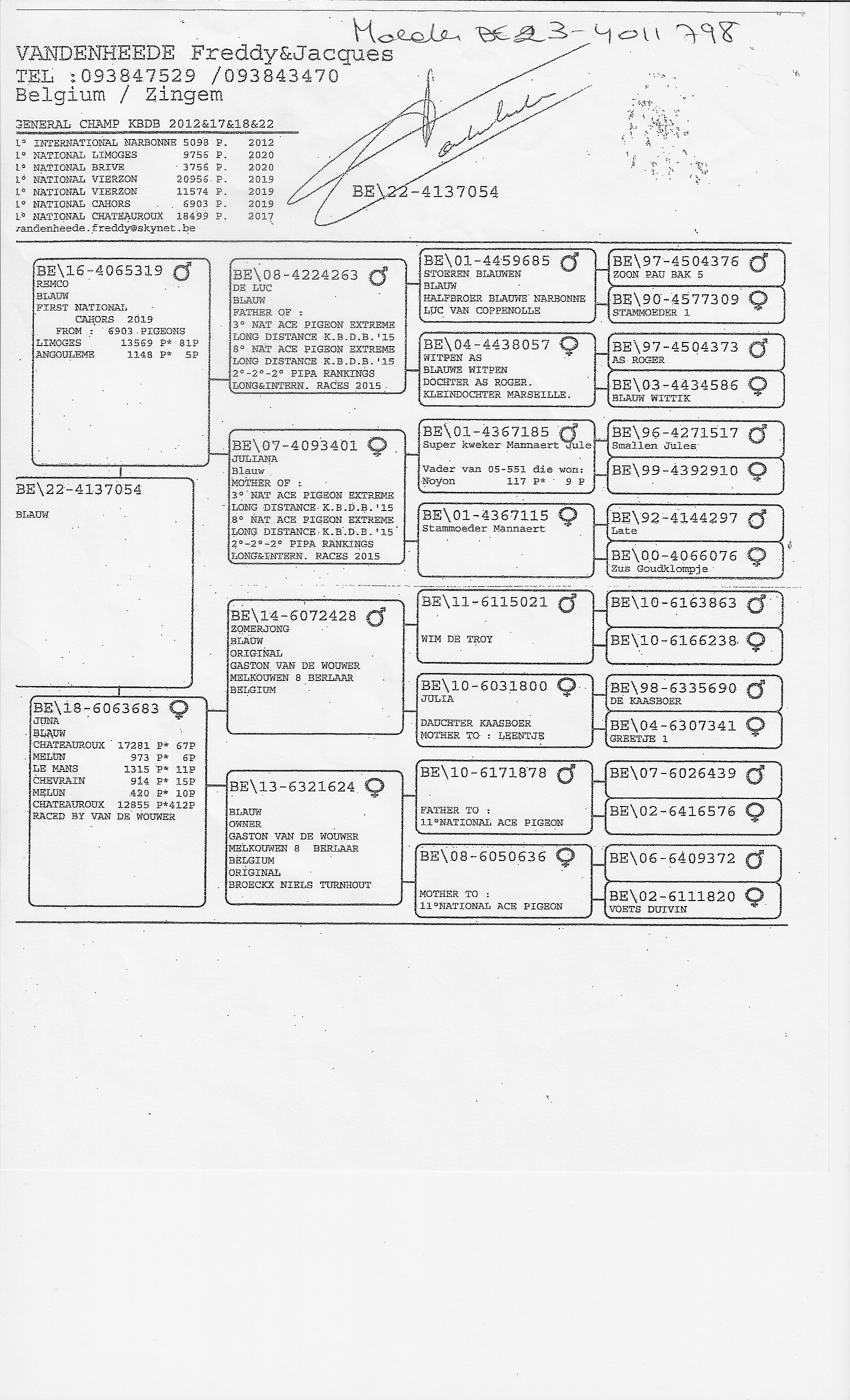 On the mother’s side, a daughter of Remco, 1st National Cahors – 6,905 pigeons, raced by F&J Vandenheede, Kruisem, and bred from the pairing Luc × Juliana. Together, Luc × Juliana, besides Remco, also produced multiple top pigeons, including: