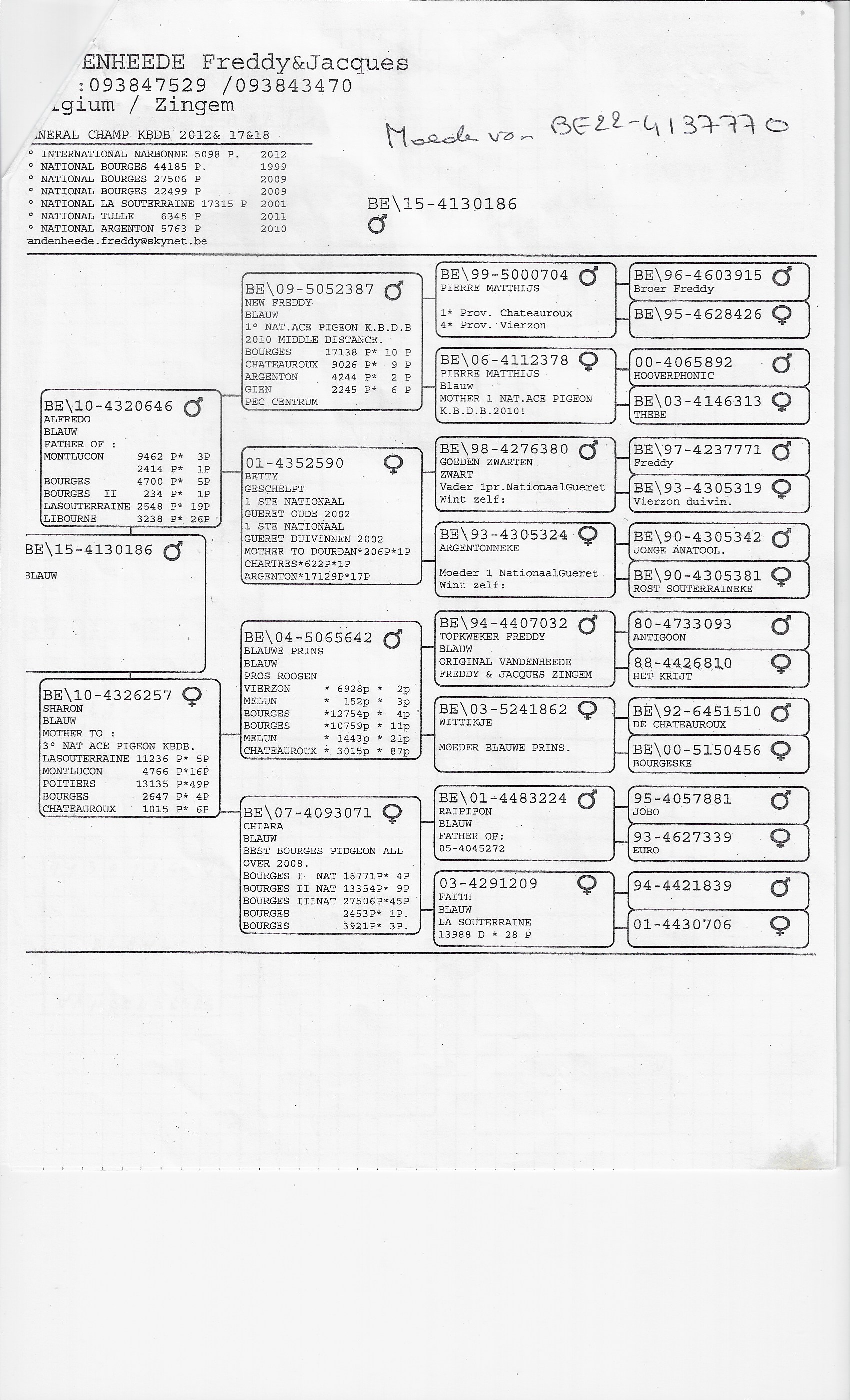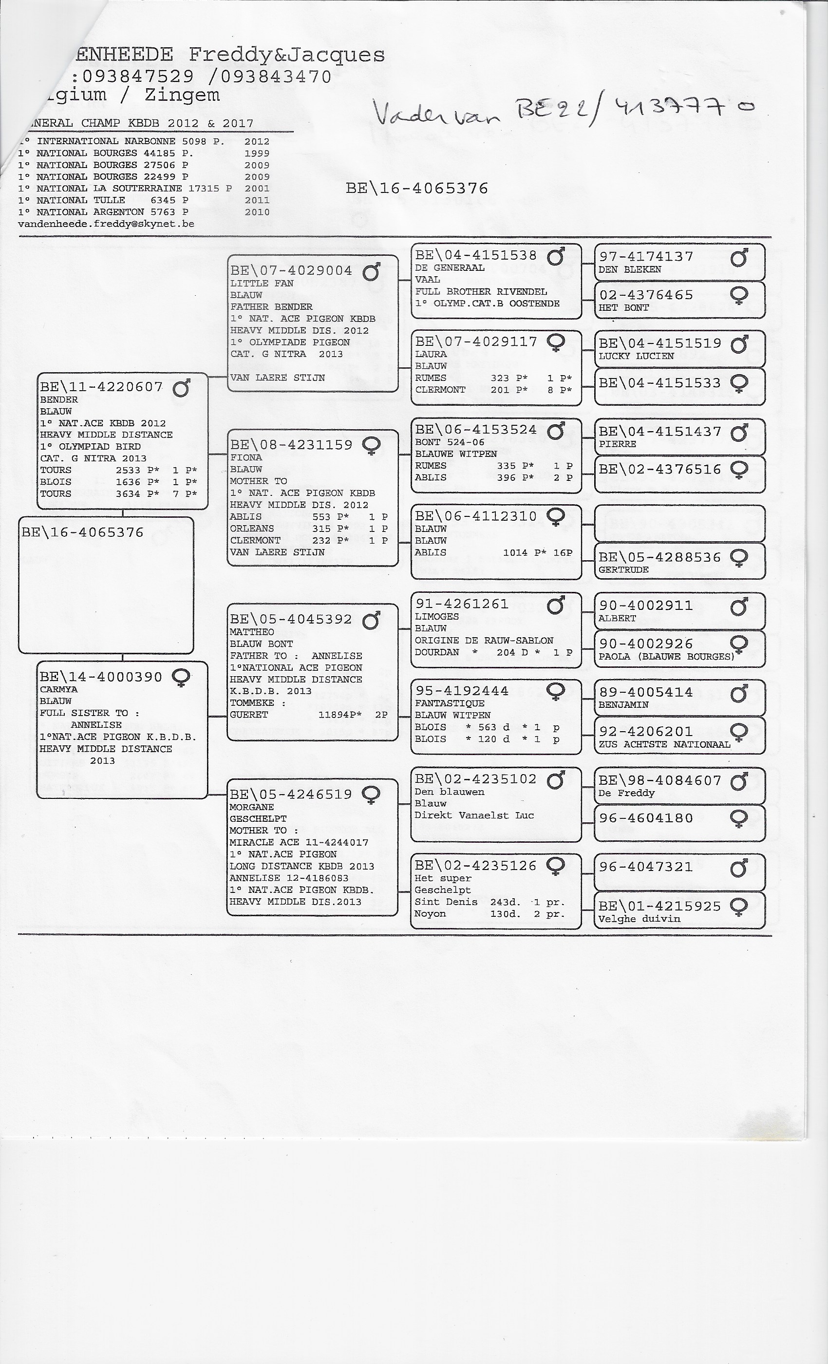 Father: Little Fan (BE07‑4029004), son of “De Generaal”, who had an impressive record with 11 first prizes.
