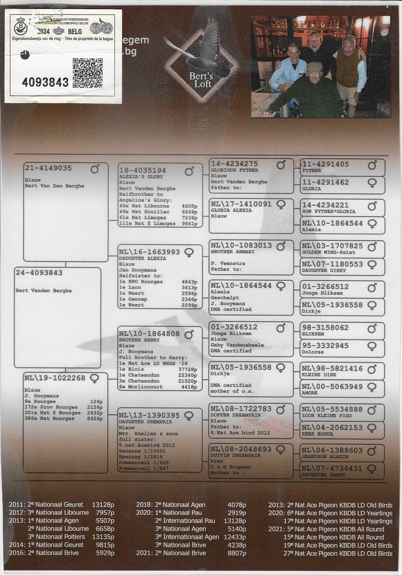 • Dario: 1st Prov. Poitiers 1,688 b., sire of Icarus, best young bird of Belgium over 4 national races in 2023