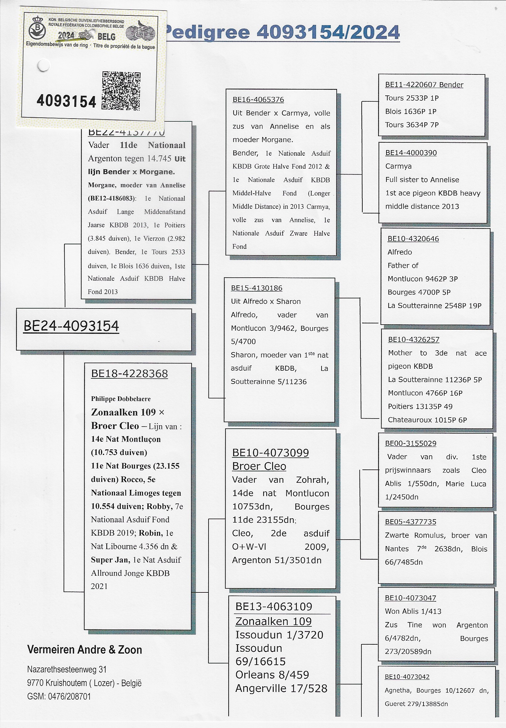 BE24-4093150 - Kleinzoon 1ste nat asduif KBDB grote halve fond en nationale/provinciale winnaars