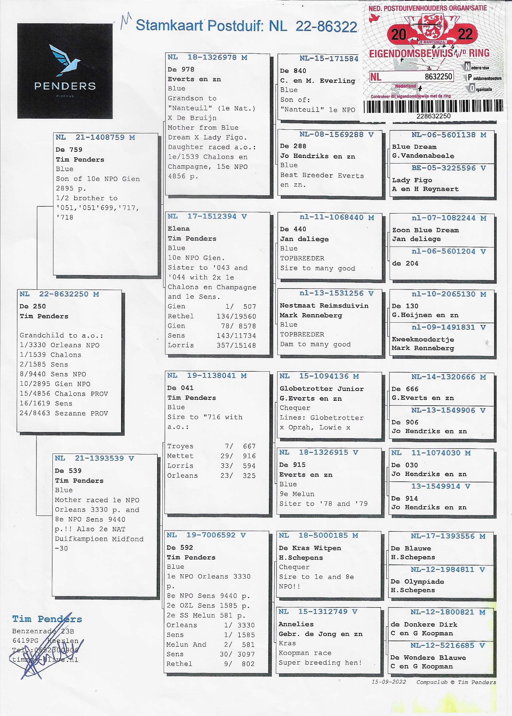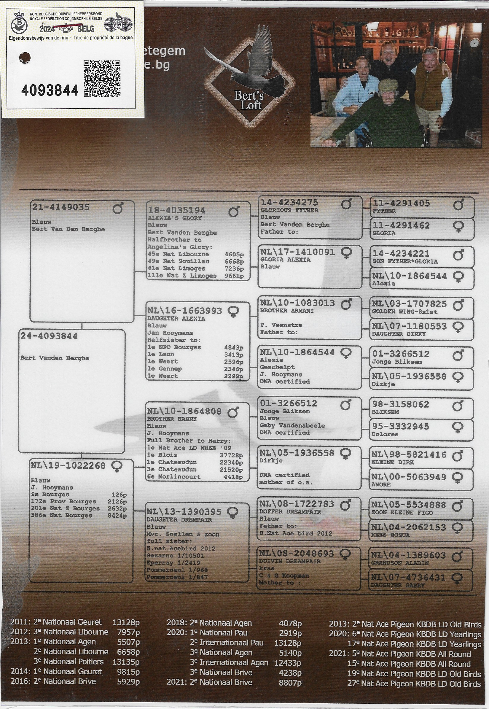 “Alexia”, full sister of Harry and winner of 1st NPO Châteauroux, is also present in this pigeon’s pedigree.