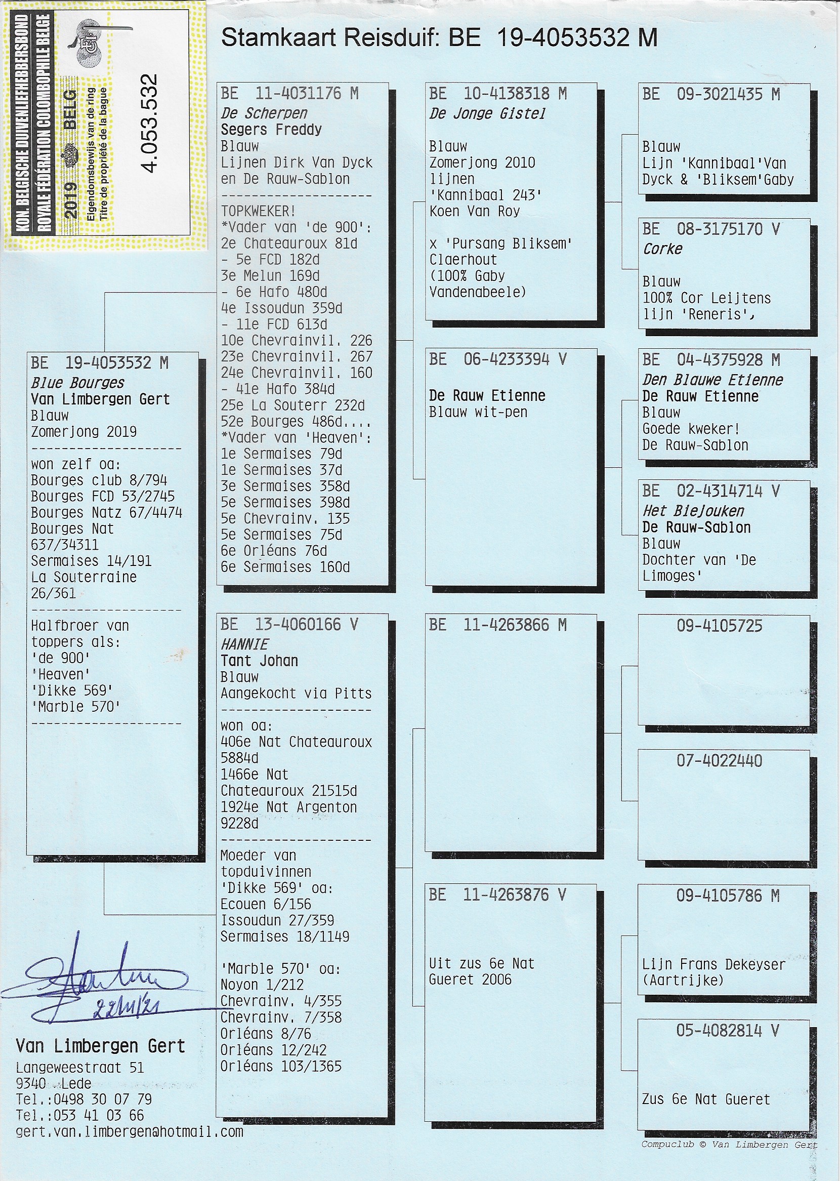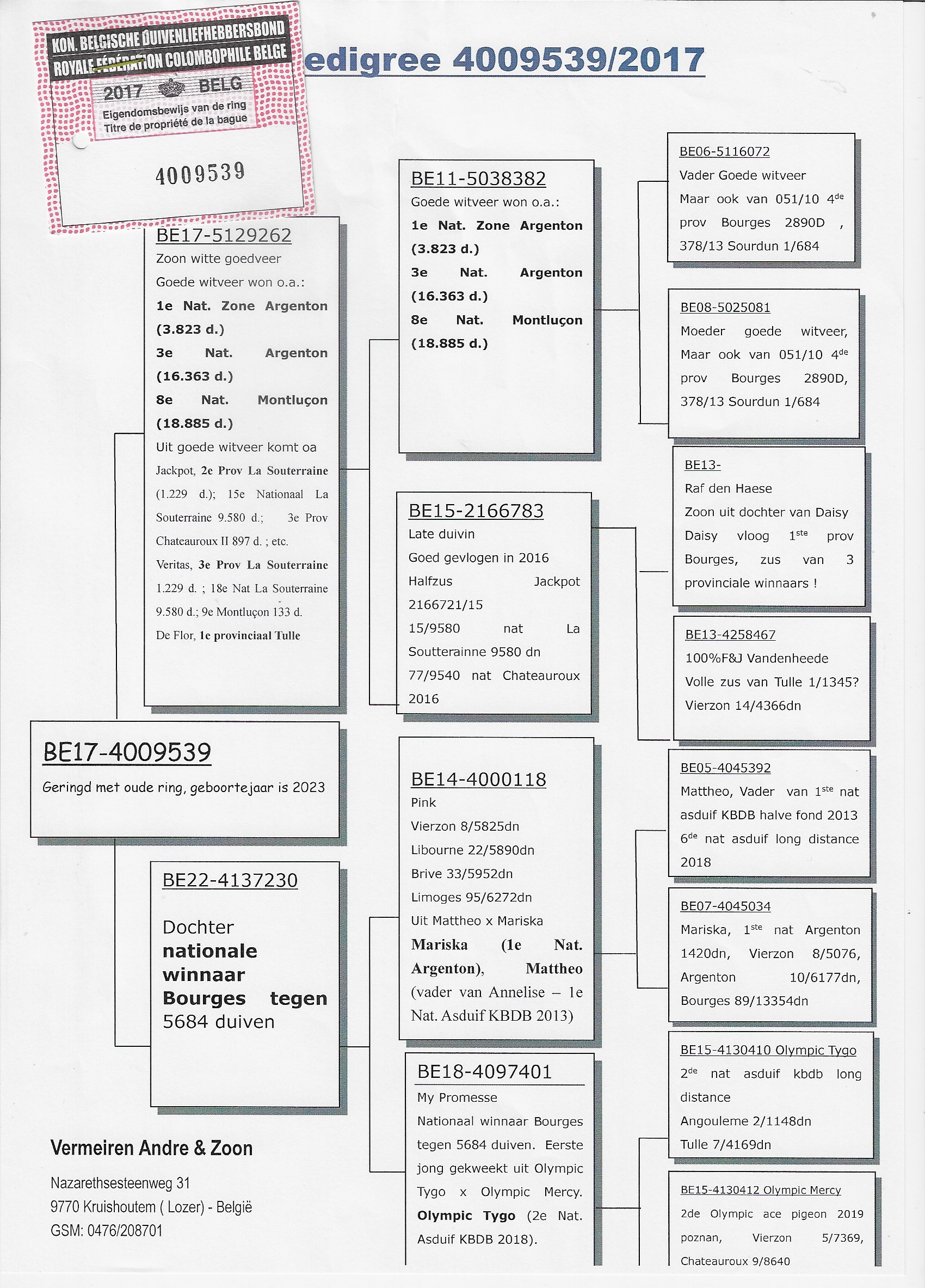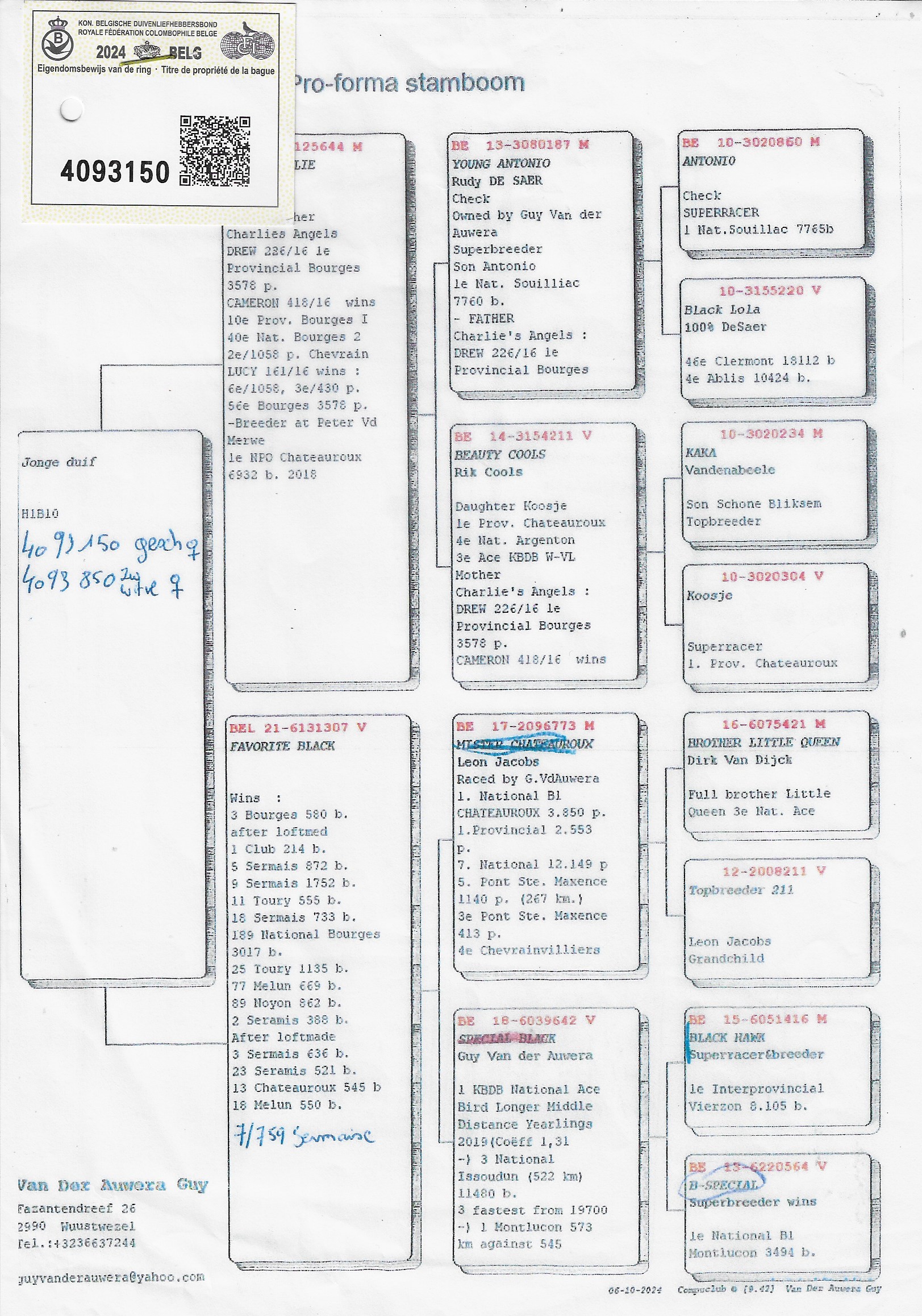 Top pedigree from the champion loft of Guy Van der Auwera (Wuustwezel)