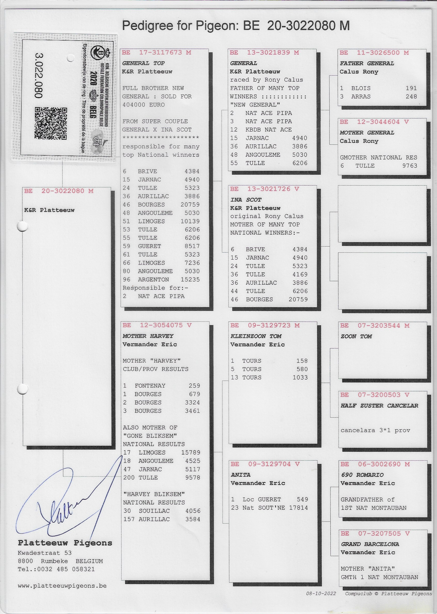 Mattheo (BE05-4045392), a direct son of the legendary Limoges of De Rauw-Sablon × Fantastique, is a top breeder with national-level results in his descendants: