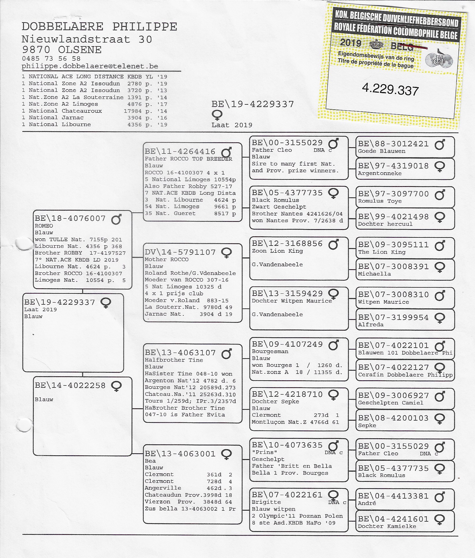 • Belinda: 4th Prov. Ace Pigeon Heavy Middle Distance 2016, 3rd Zone Châteauroux (5,090 b.)