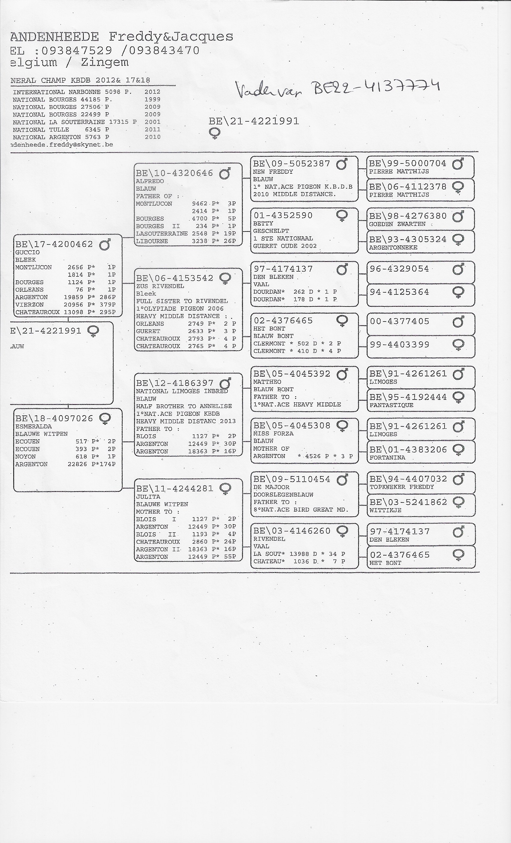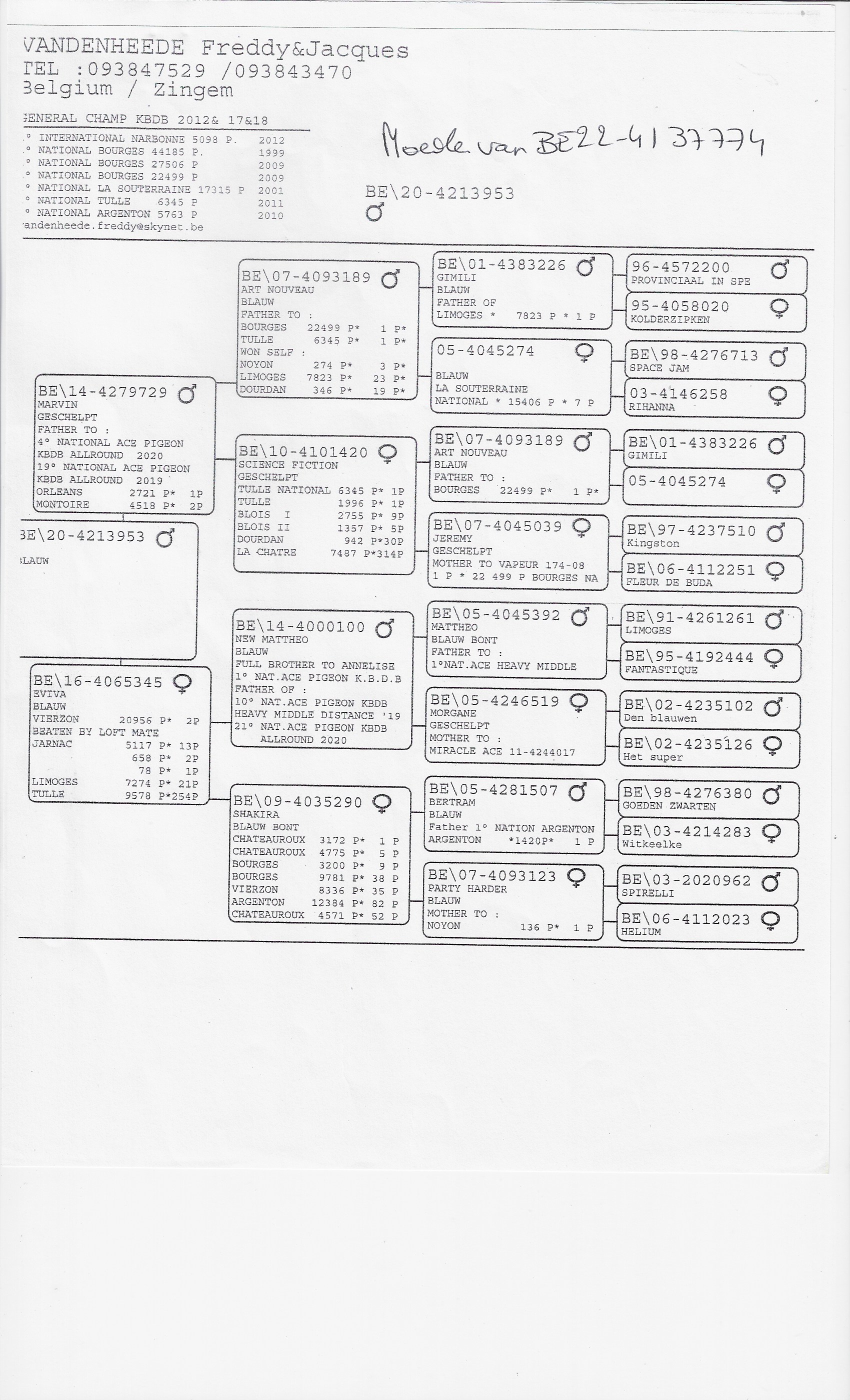 21st Tulle 7,274 b.New Mattheo is a brother of the 1st National Ace Pigeon Middle Distance KBDB ’13 and 6th National Ace Pigeon Long Distance KBDB ’18, and sire of the 10th Nat. Ace Pigeon KBDB Heavy Middle Distance.