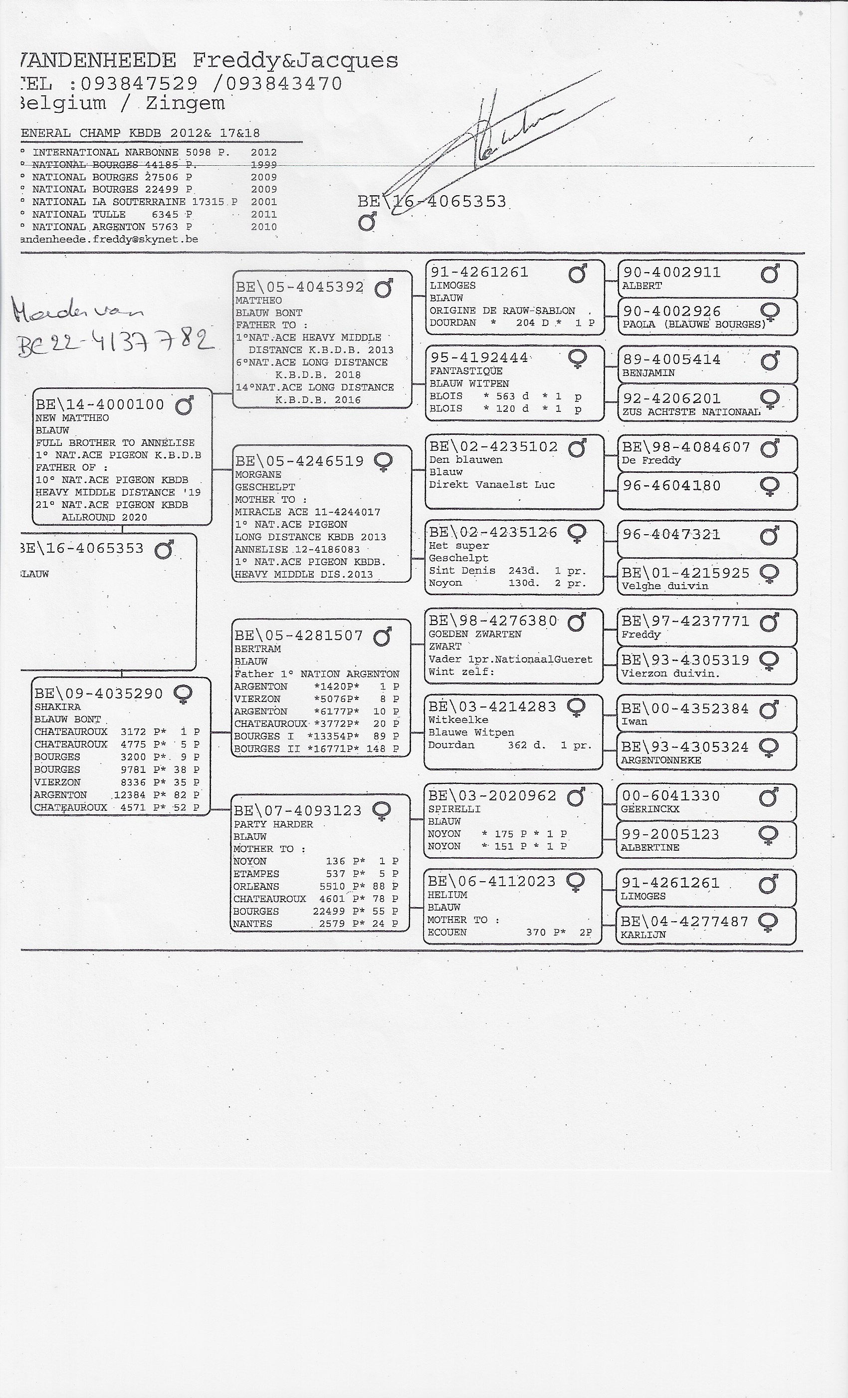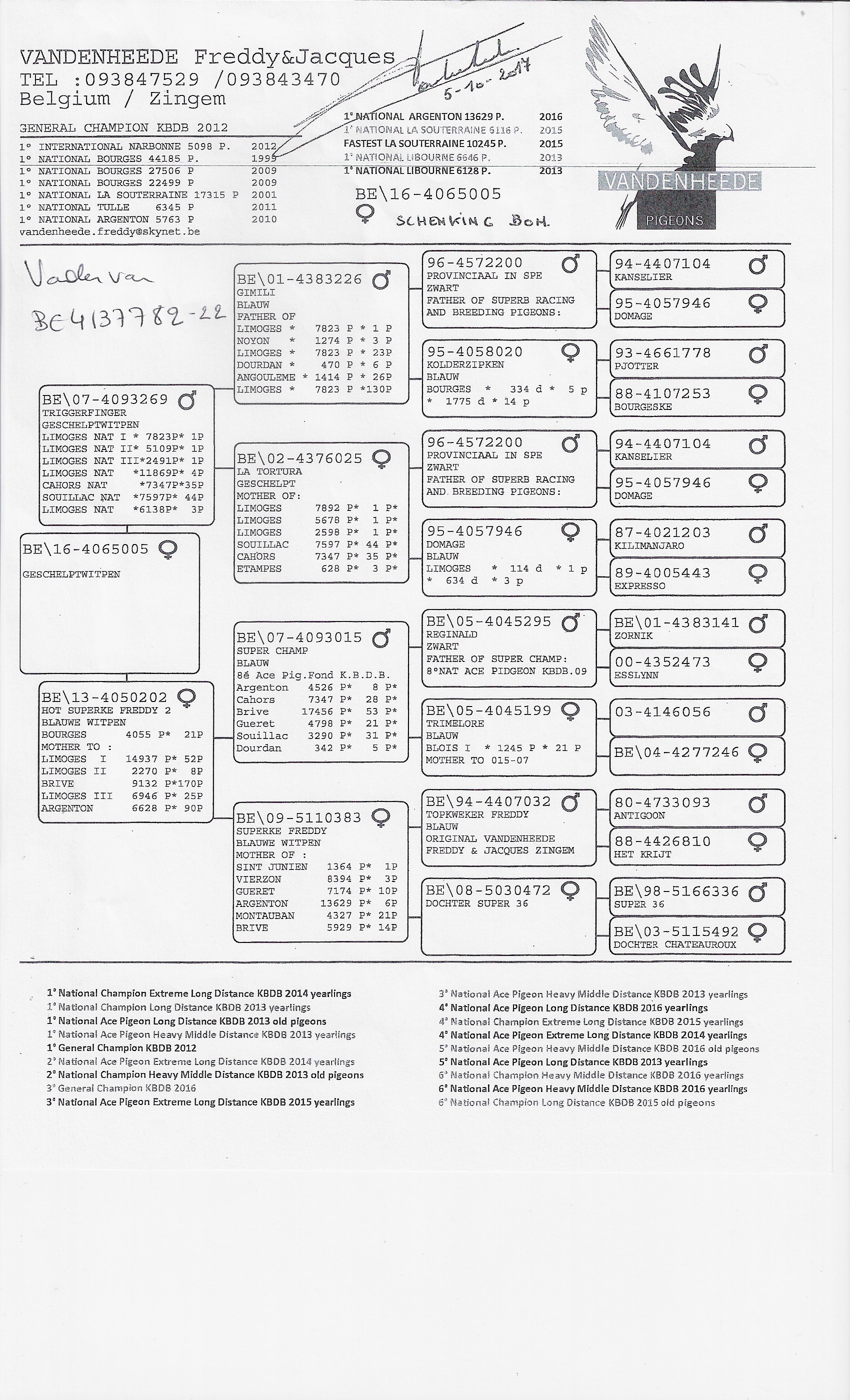 This pigeon comes directly from the prestigious breeding lines of F&J Vandenheede of Zingem, a name that in international pigeon sport is synonymous with absolute top quality and champion heritage. The Vandenheede brothers built their colony into one of the most successful lofts in Belgium, with numerous national victories, ace pigeon titles, and international references to their name.
