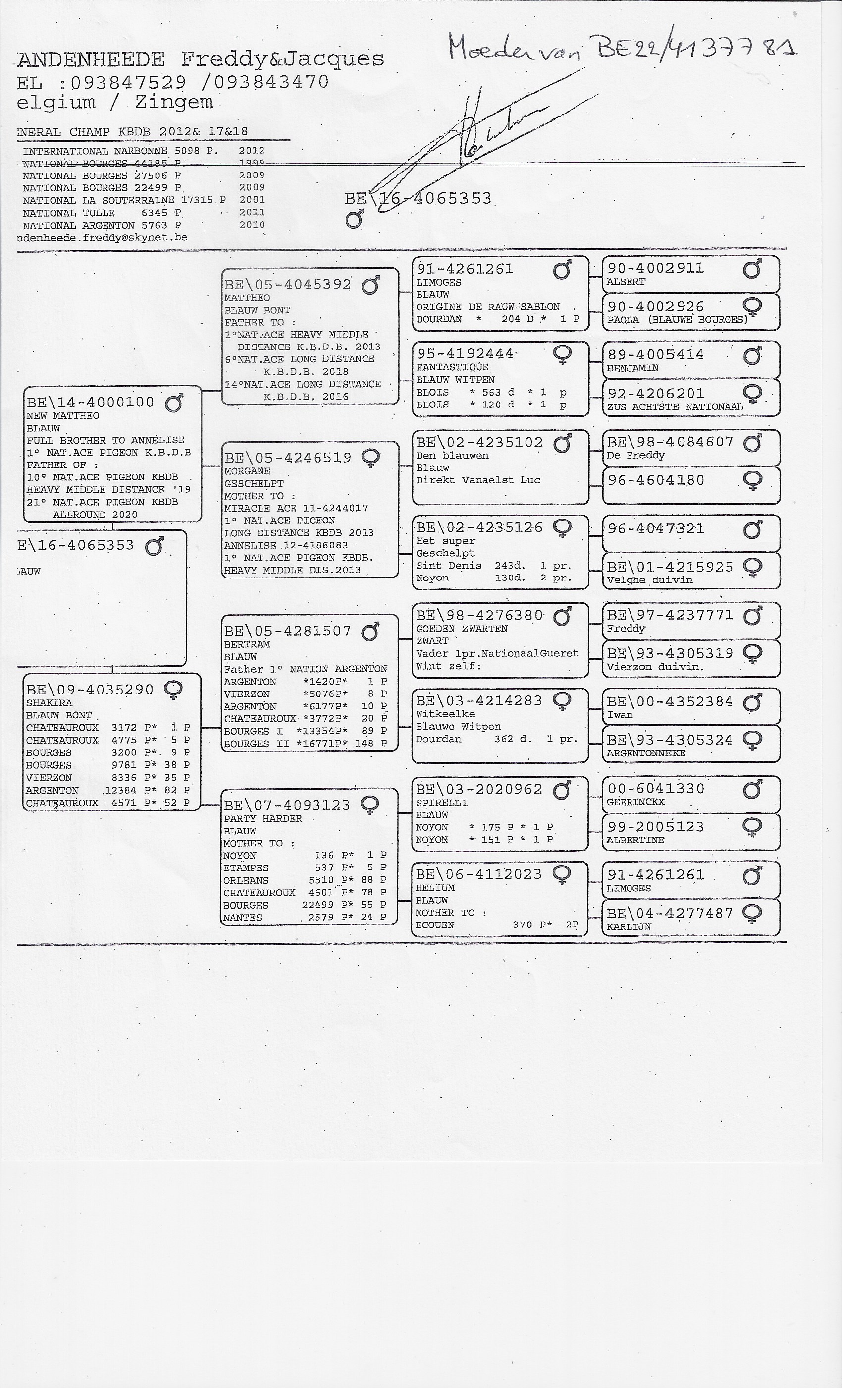 Also brother of Tommeke – 2nd Nat. Guéret (11,894 b.) and Woody – sire of 1st Nat. Zone Châteauroux (2,780 b.).Daughter of Shakira (BE09-4035290), Provincial winner Châteauroux 3,172 b.,
