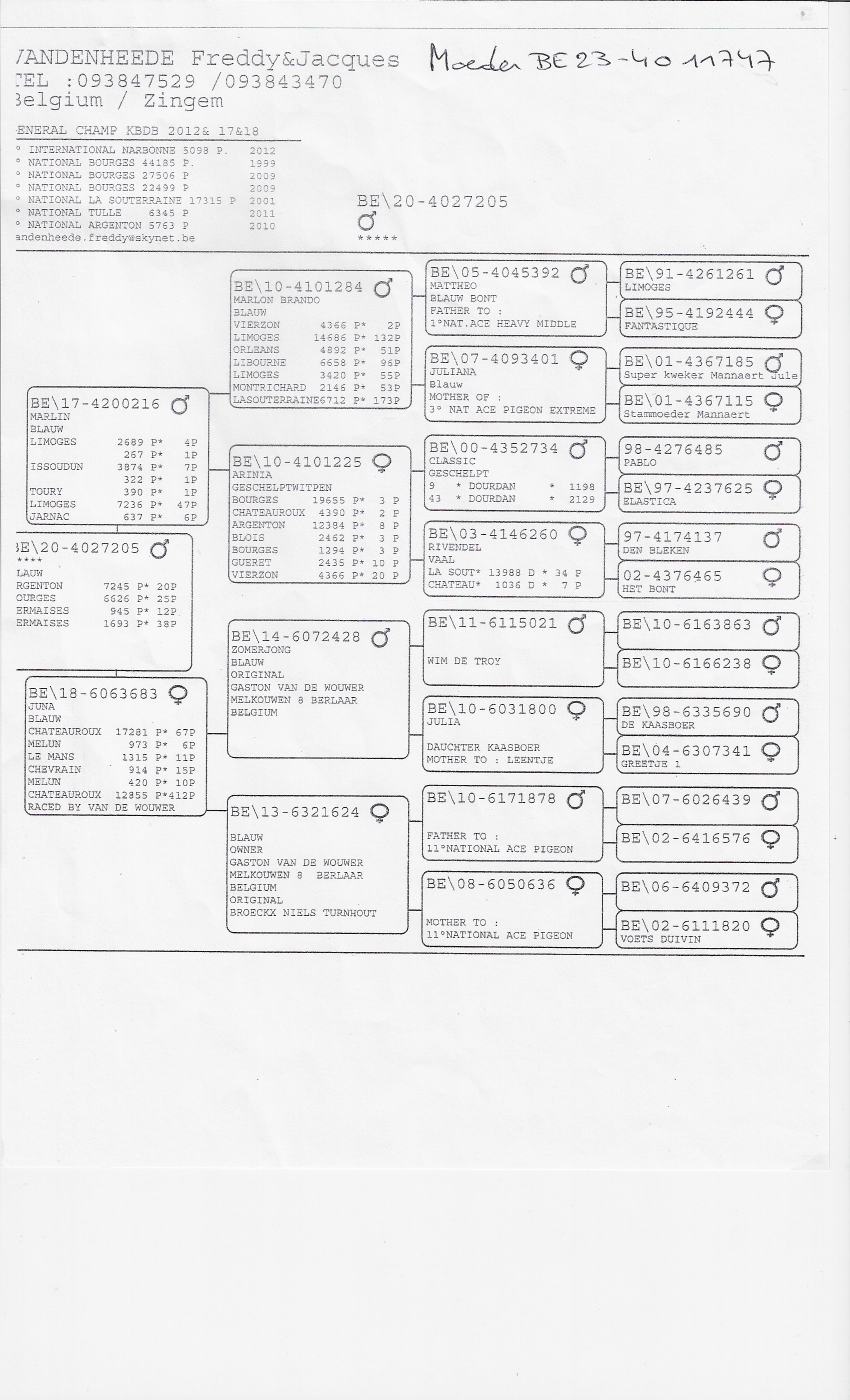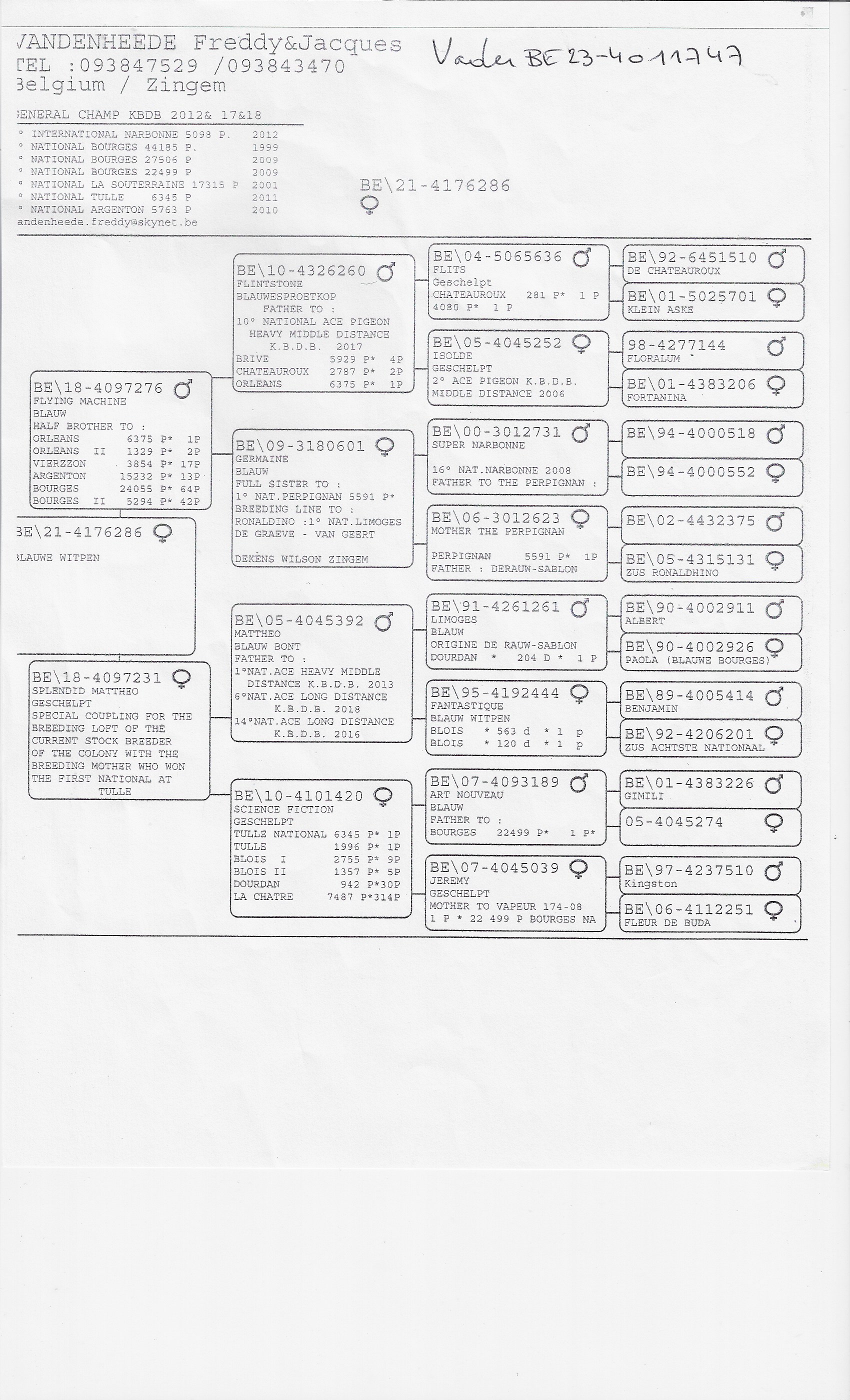 This pigeon combines top genes from two of the most successful lines of Freddy & Jacques Vandenheede.