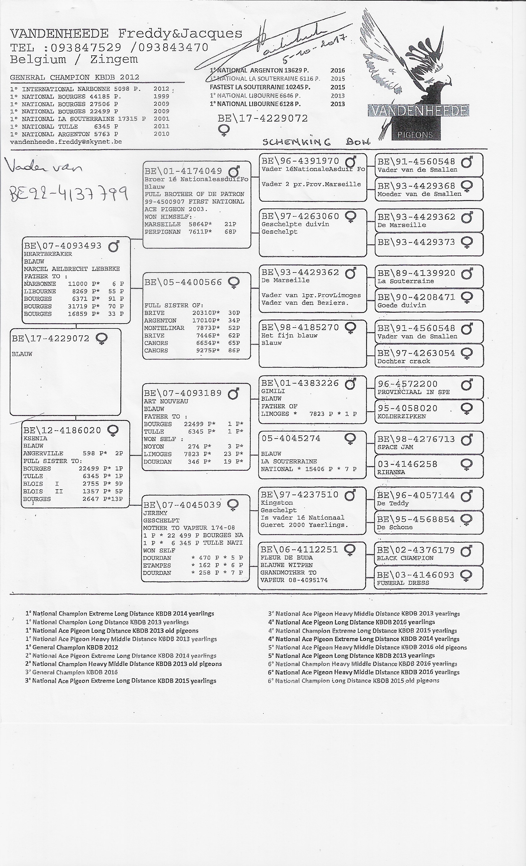 This pigeon comes directly from the prestigious breeding lines of F&J Vandenheede of Zingem, a name that in international pigeon racing is synonymous with absolute top quality and champion heritage. The Vandenheede brothers have developed their colony into one of the most successful lofts in Belgium, with countless national victories, ace pigeon titles, and international references to their credit.