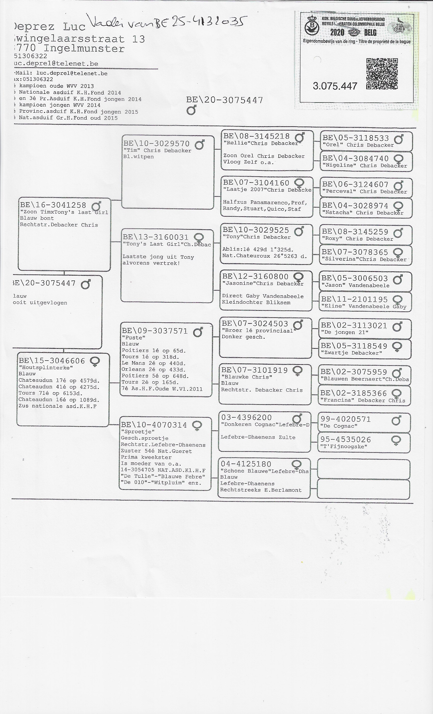9th Montluçon 1,167 b.And further strengthened with top blood from Chris Debacker, via a full brother to 1st National Châteauroux 10,591 b. and the line of the 4th National Ace HAFO KBDB, best of Belgium on four national races in 2012.