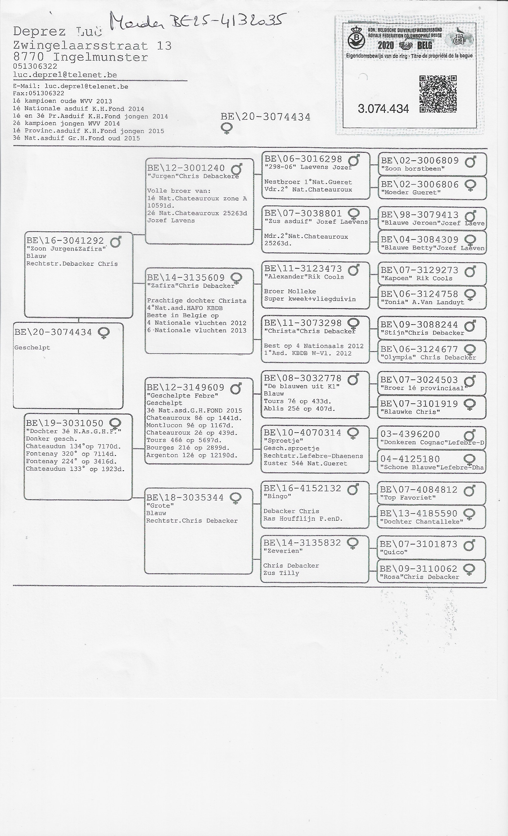 Houtsplinterke is a sister of a National Ace Pigeon Small Middle Distance and comes from Sproetje (Bernard Lefebre), sister of 54th National Guéret.Granddaughter of “Geschelpte Febre”, 3rd National Ace Pigeon Great Middle Distance 2015, with among others: