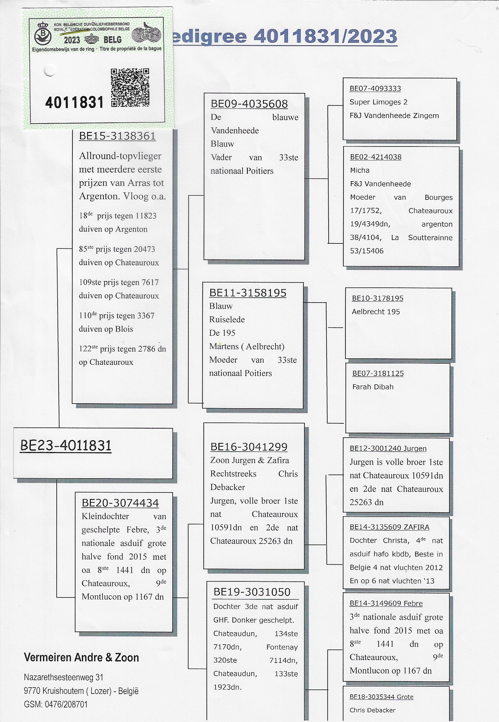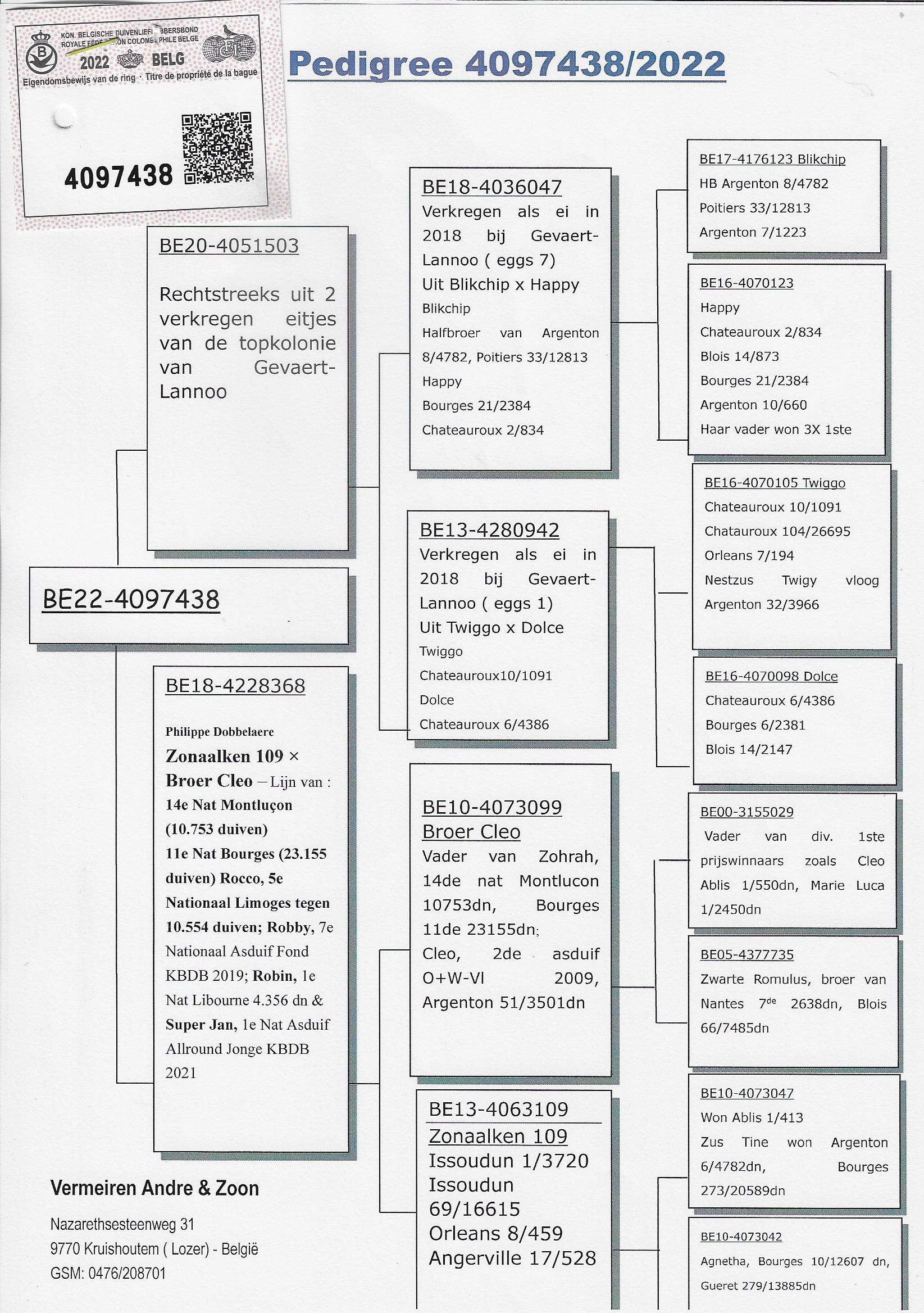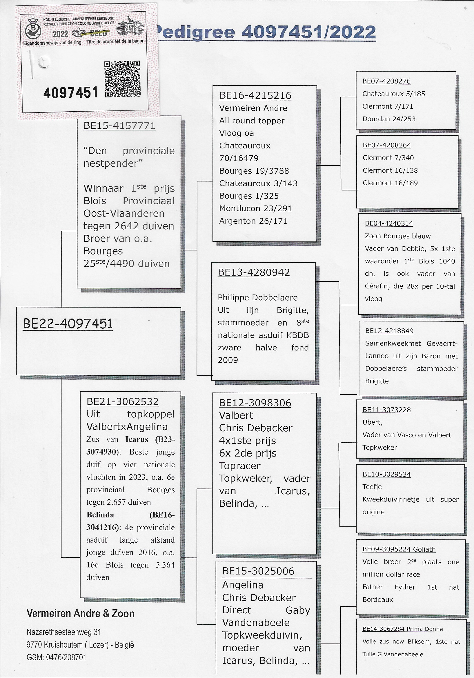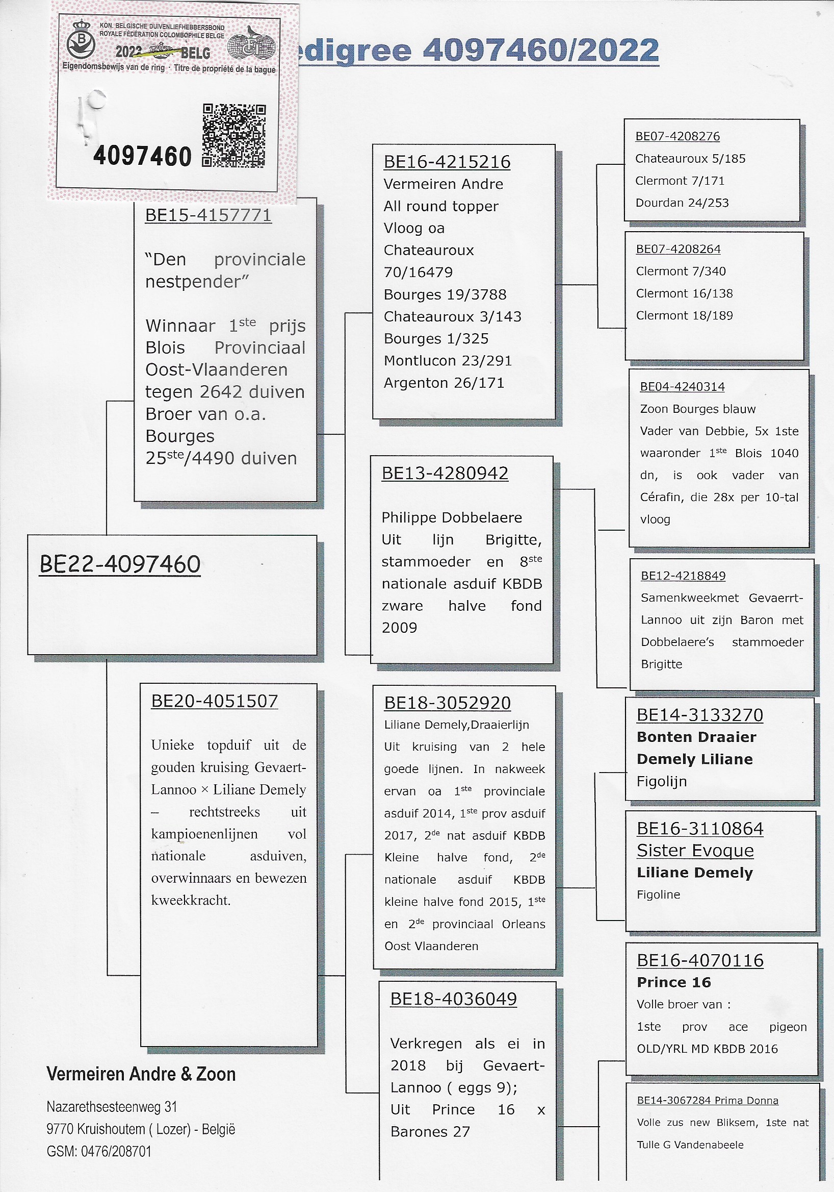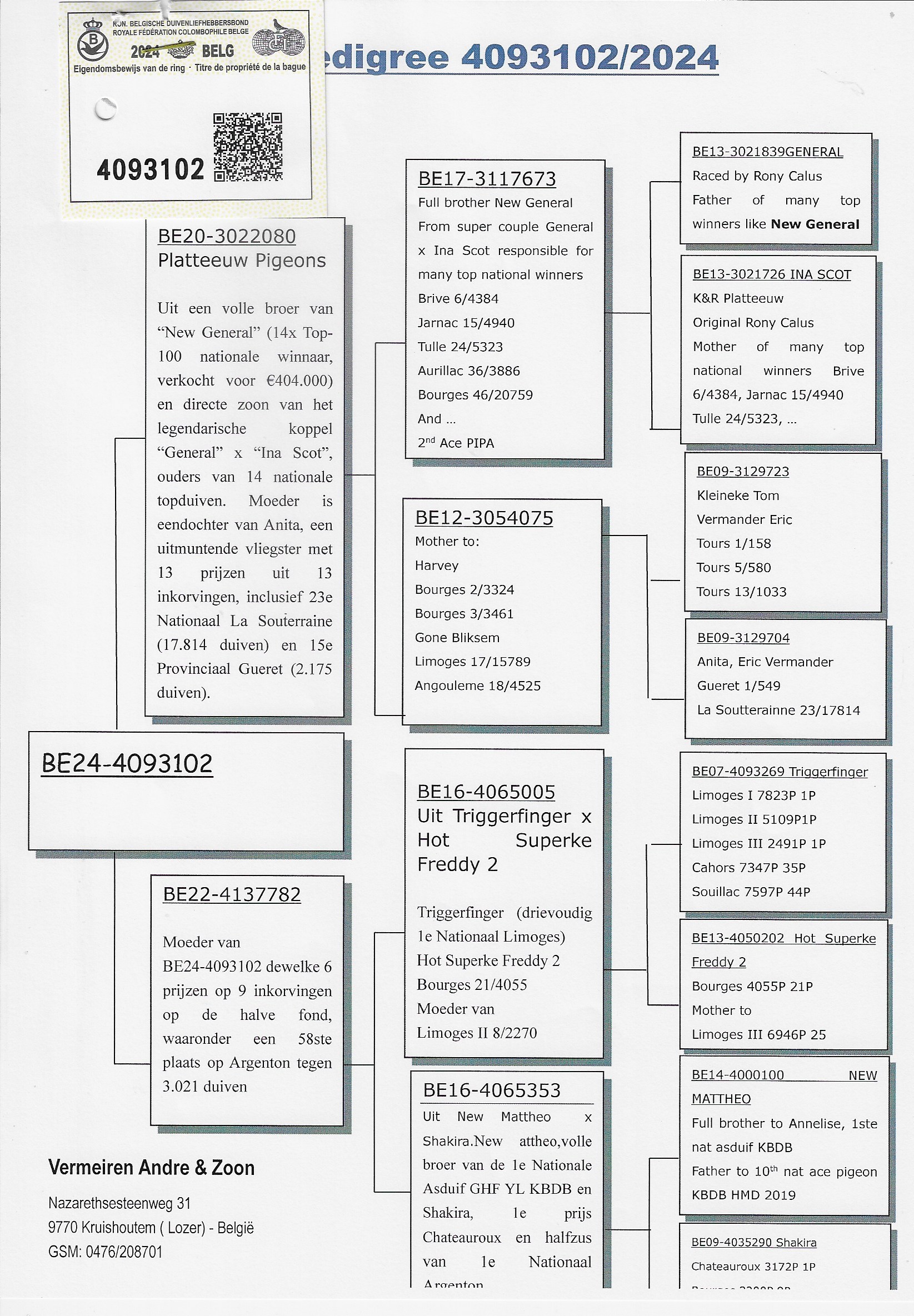 Après une sélection rigoureuse et minutieuse, cette vente comprend tous les pigeons reproducteurs du pigeonnier Vermeiren André & Fils. Il s'agit de races mondiales telles que Chris Debacker, Philippe Dobbelaere, Bert Vanden Berghe, Freddy & Jacques Vandenheede , Guy Van Der Auwera, Gevaert- Lannoo, Luc Deprez, et ce, principalement élevés à partir de vainqueurs provinciaux de 1ère classe ou de la lignée directe de vainqueurs nationaux et provinciaux de 1ère classe qui ont remporté divers classements de haut niveau, de la vitesse au demi-fond difficile. Malheureusement, l'histoire des pigeons à Kruisem touche à sa fin, après le décès du père André fin décembre 2023 et la vente de la maison familiale en 2025. Une aventure qui a commencé en 1979, avec des années de très bons résultats en vitesse et des pigeons de tête classés au niveau provincial comme cerise sur le gâteau. Dans les années 2000, la décision a été prise de passer définitivement au demi-fond et au demi-fond lourd comme nouveau défi. La barre a été placée de plus en plus haut et, en tant qu'amateur « avec le petit panier » face à des colombophiles de renom, cette transition s'est tout de même accompagnée de plusieurs classements dans le top 100 au niveau national et provincial, avec en prime la victoire provinciale à Blois avec « le provincial nestpender 771 », dont plusieurs descendants sont encore en vente. C'est la fin d'une lignée d'élevage soigneusement développée au fil des ans et donc l'occasion de poursuivre le travail de Vermeiren et d'en tirer encore plus de succès!