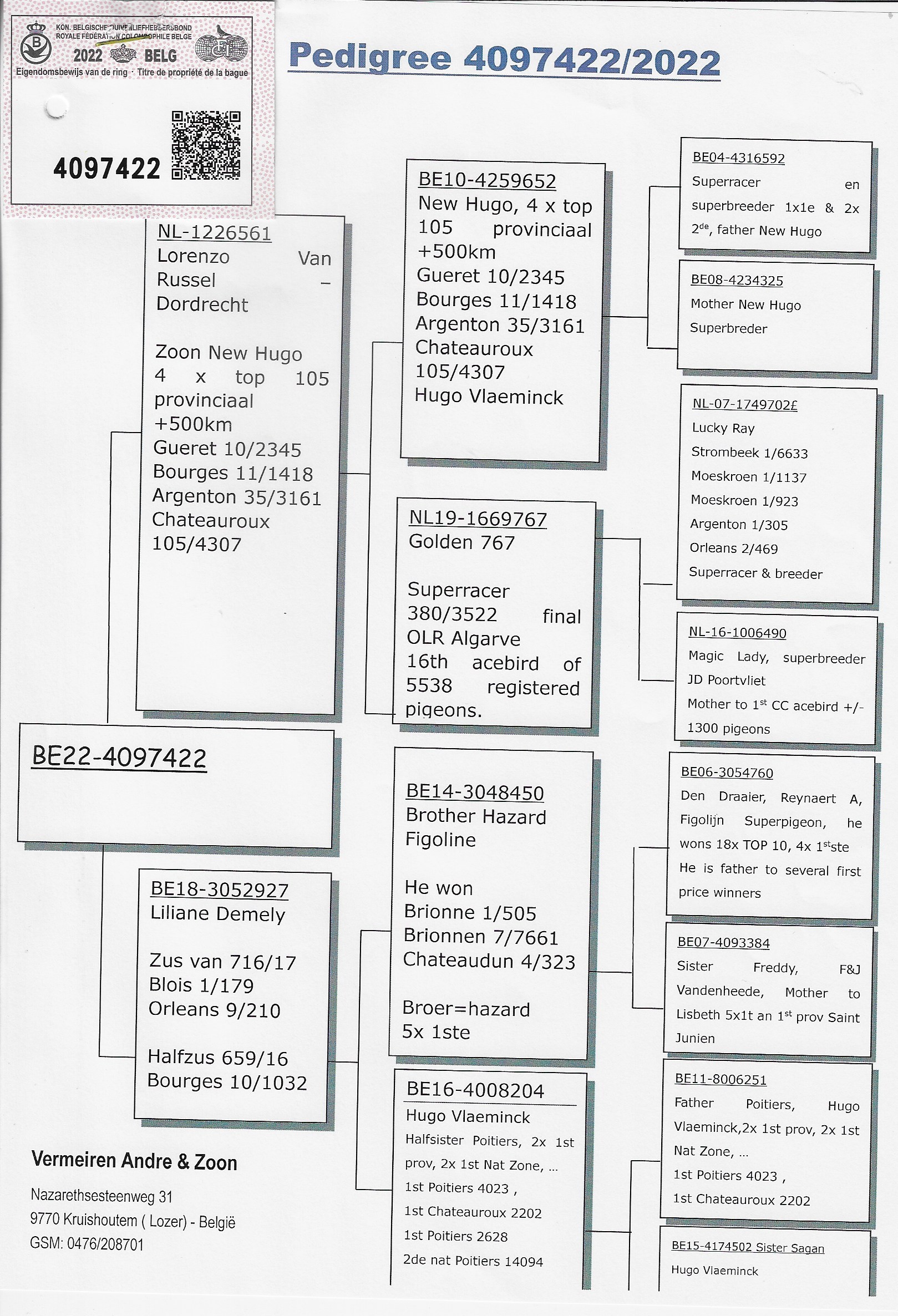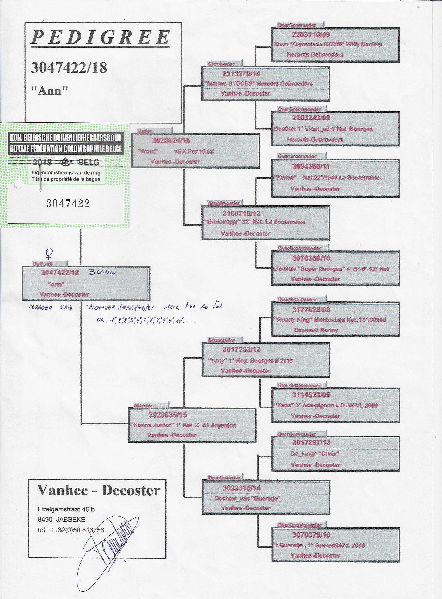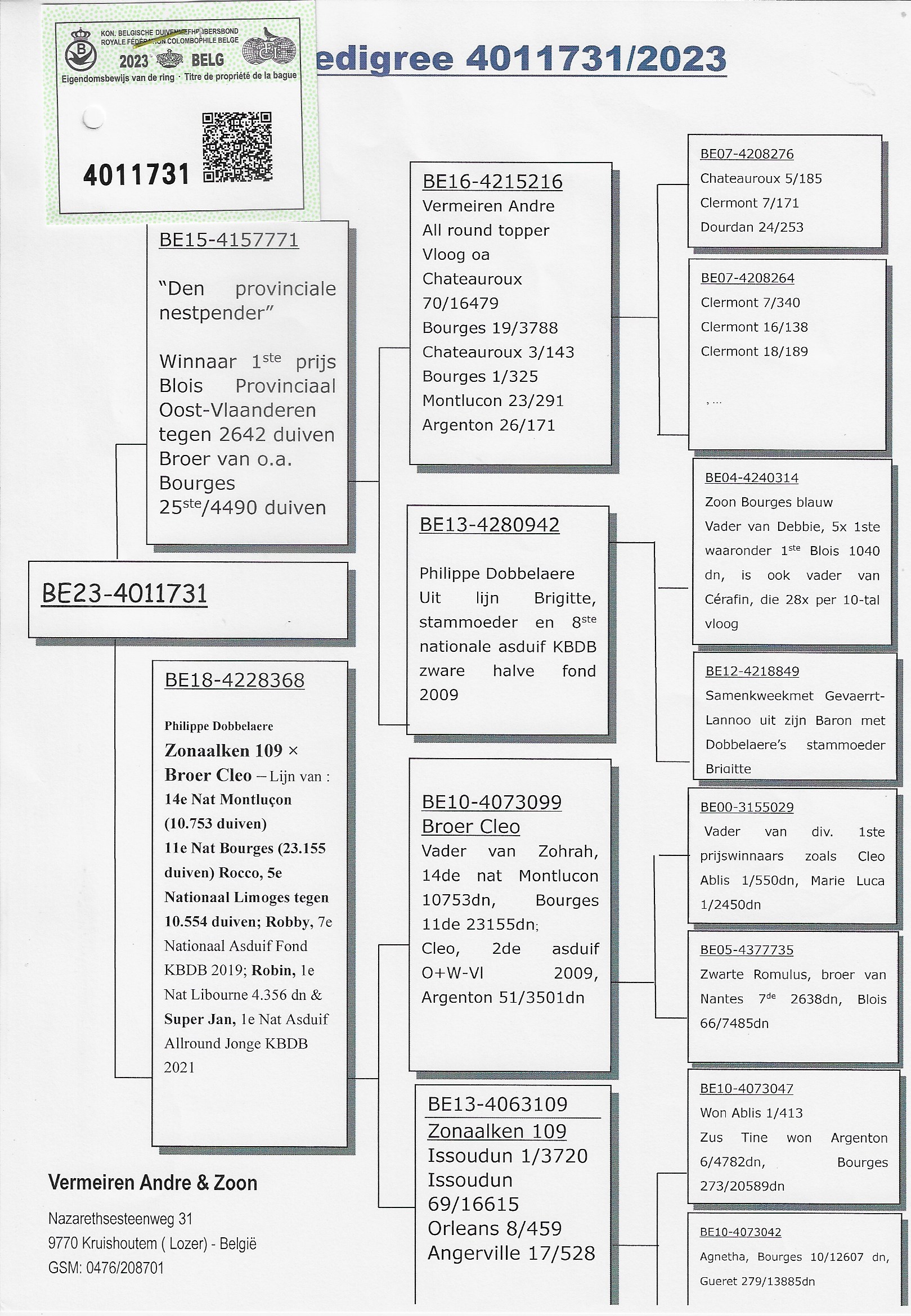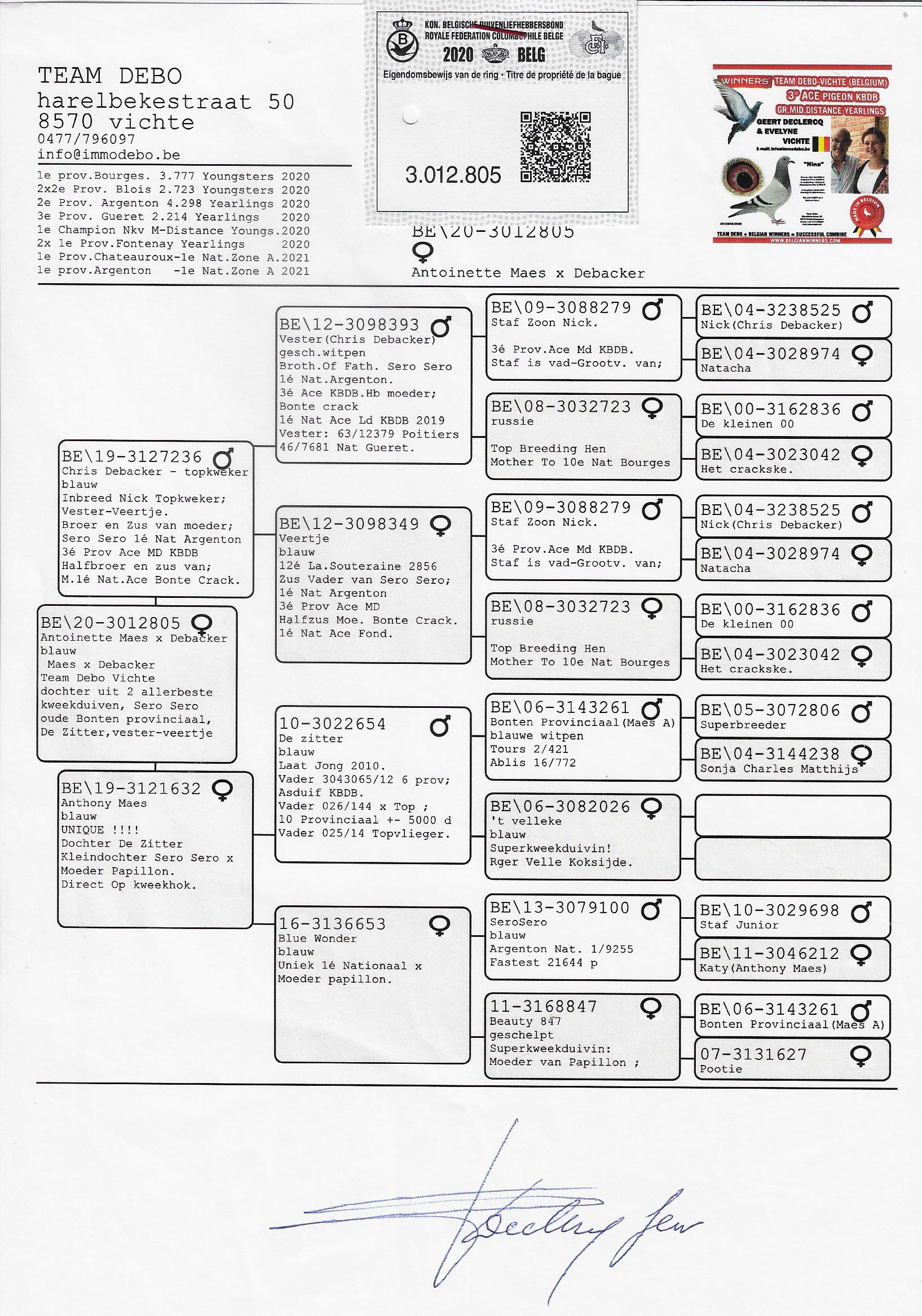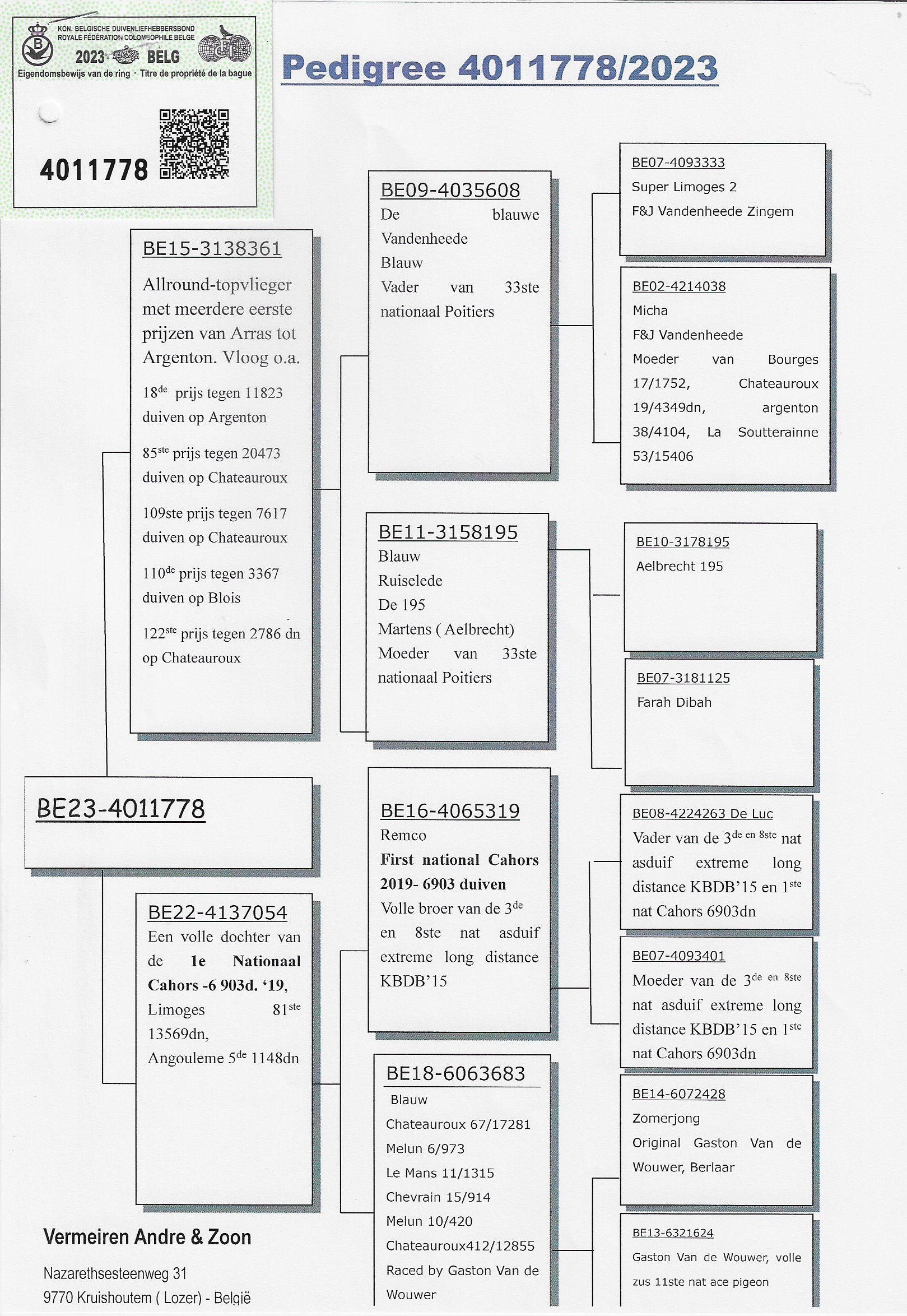 Après une sélection rigoureuse et minutieuse, cette vente comprend tous les pigeons reproducteurs du pigeonnier Vermeiren André & Fils. Il s'agit de races mondiales telles que Chris Debacker, Philippe Dobbelaere, Bert Vanden Berghe, Freddy & Jacques Vandenheede , Guy Van Der Auwera, Gevaert- Lannoo, Luc Deprez, et ce, principalement élevés à partir de vainqueurs provinciaux de 1ère classe ou de la lignée directe de vainqueurs nationaux et provinciaux de 1ère classe qui ont remporté divers classements de haut niveau, de la vitesse au demi-fond difficile. Malheureusement, l'histoire des pigeons à Kruisem touche à sa fin, après le décès du père André fin décembre 2023 et la vente de la maison familiale en 2025. Une aventure qui a commencé en 1979, avec des années de très bons résultats en vitesse et des pigeons de tête classés au niveau provincial comme cerise sur le gâteau. Dans les années 2000, la décision a été prise de passer définitivement au demi-fond et au demi-fond lourd comme nouveau défi. La barre a été placée de plus en plus haut et, en tant qu'amateur « avec le petit panier » face à des colombophiles de renom, cette transition s'est tout de même accompagnée de plusieurs classements dans le top 100 au niveau national et provincial, avec en prime la victoire provinciale à Blois avec « le provincial nestpender 771 », dont plusieurs descendants sont encore en vente. C'est la fin d'une lignée d'élevage soigneusement développée au fil des ans et donc l'occasion de poursuivre le travail de Vermeiren et d'en tirer encore plus de succès!