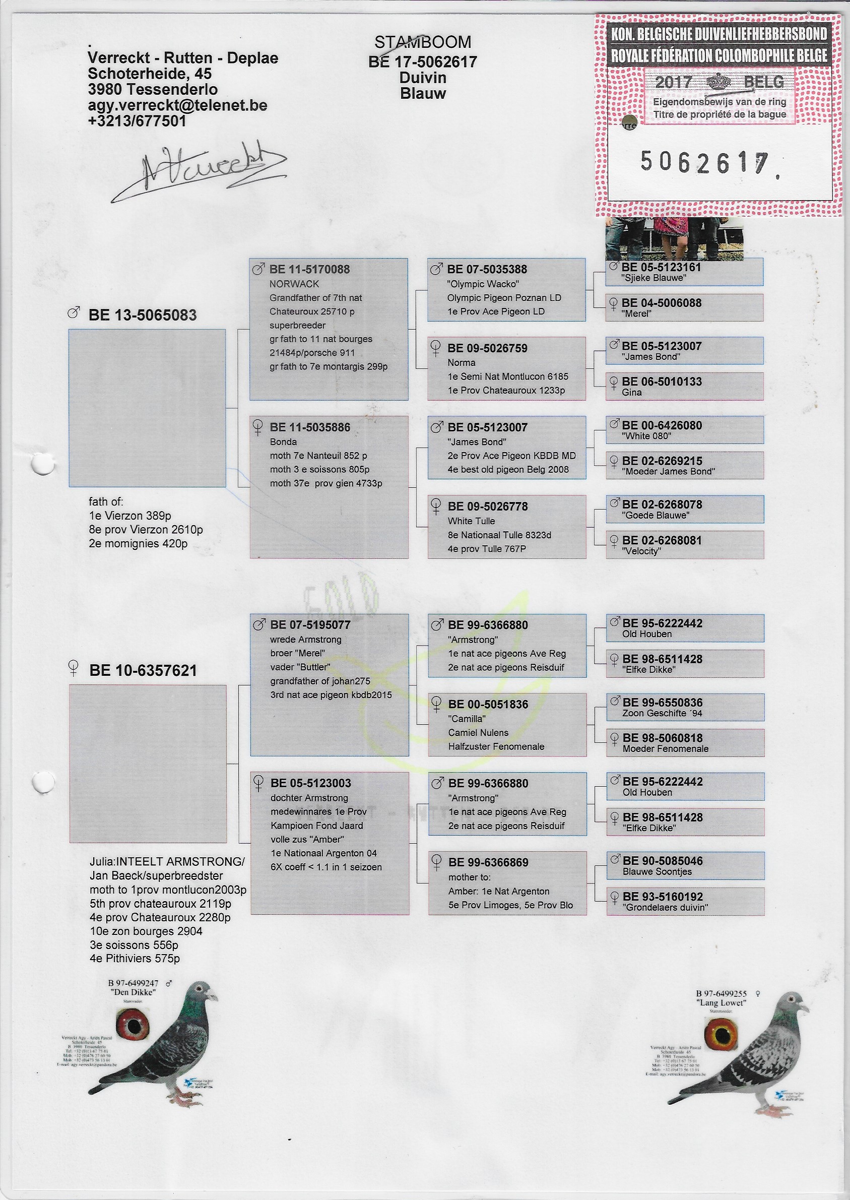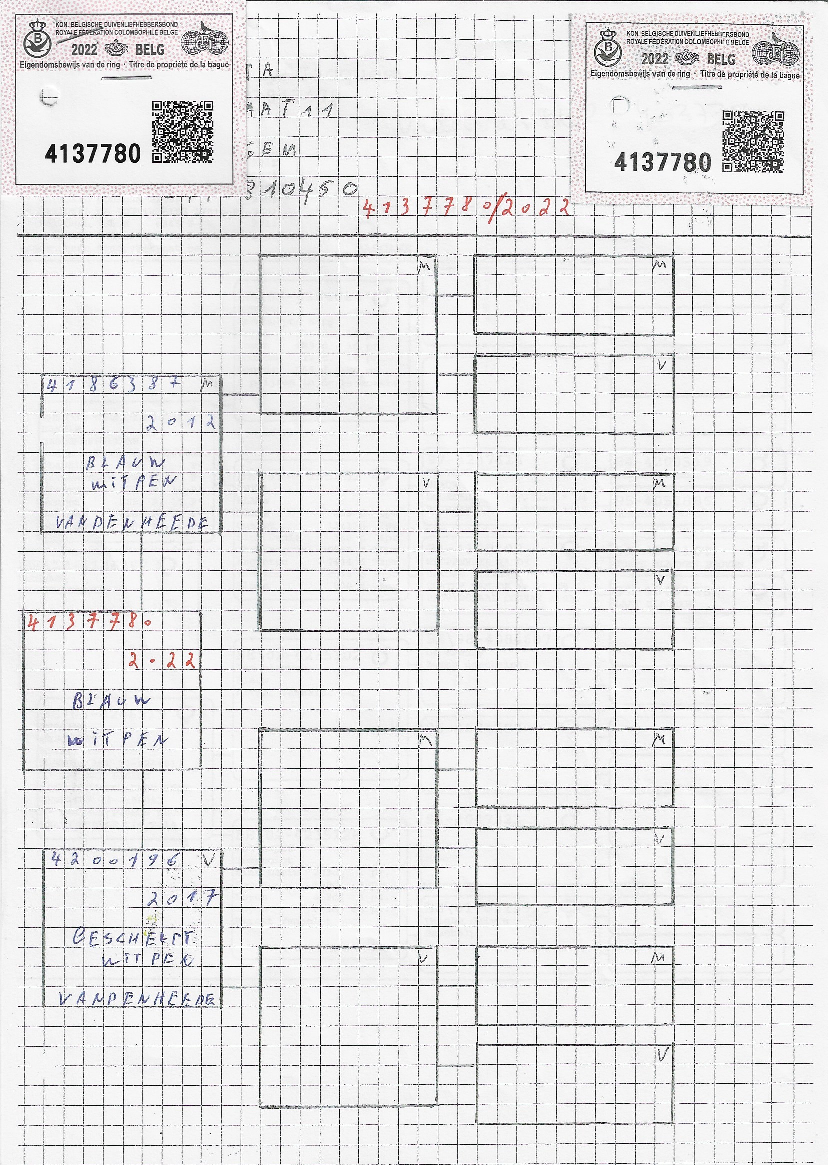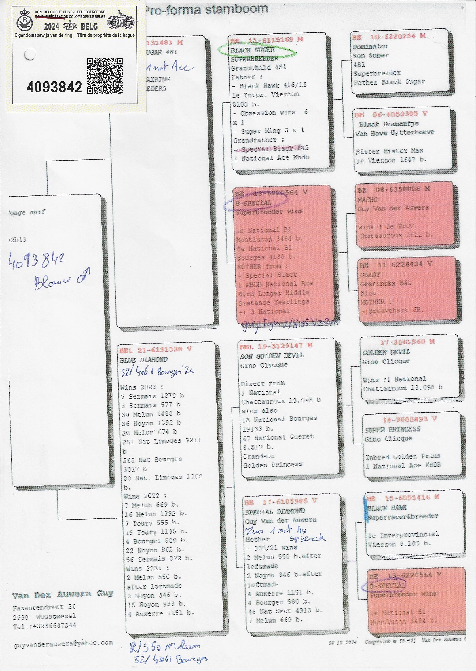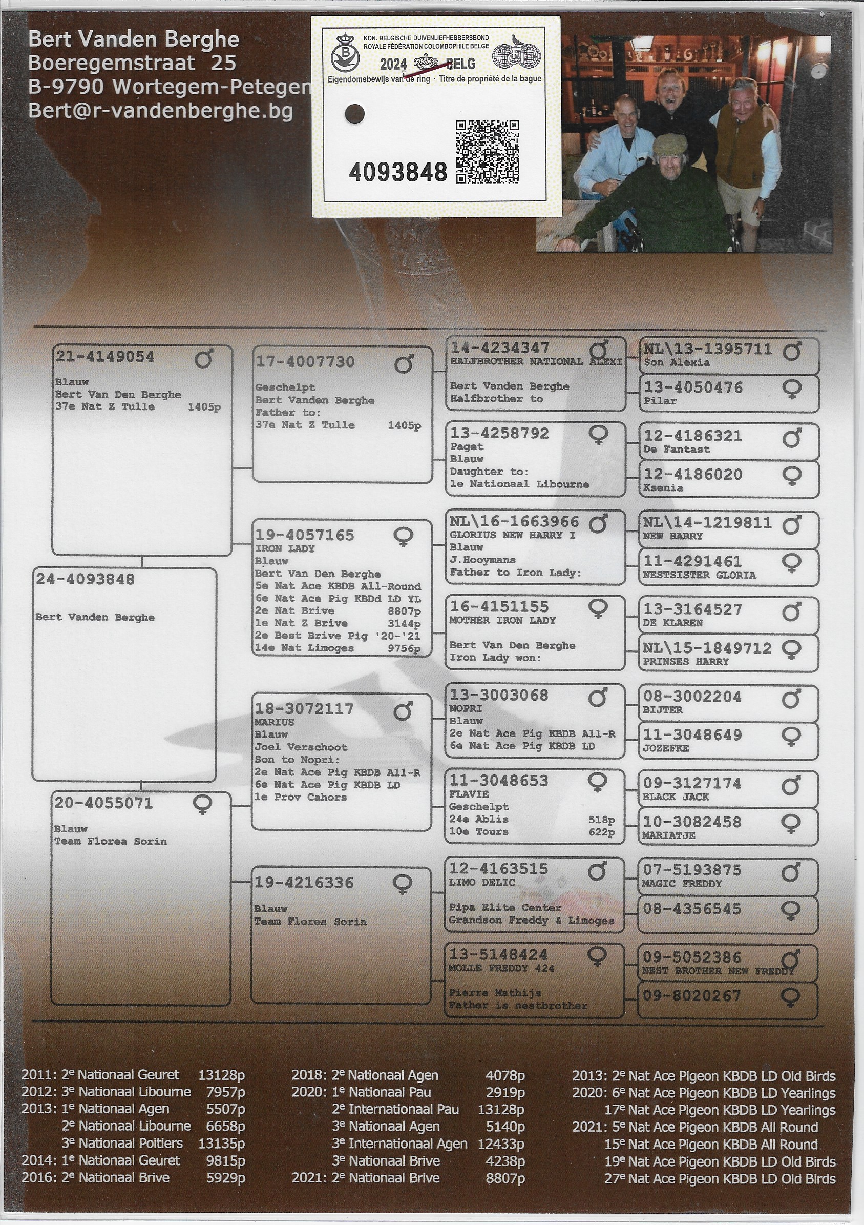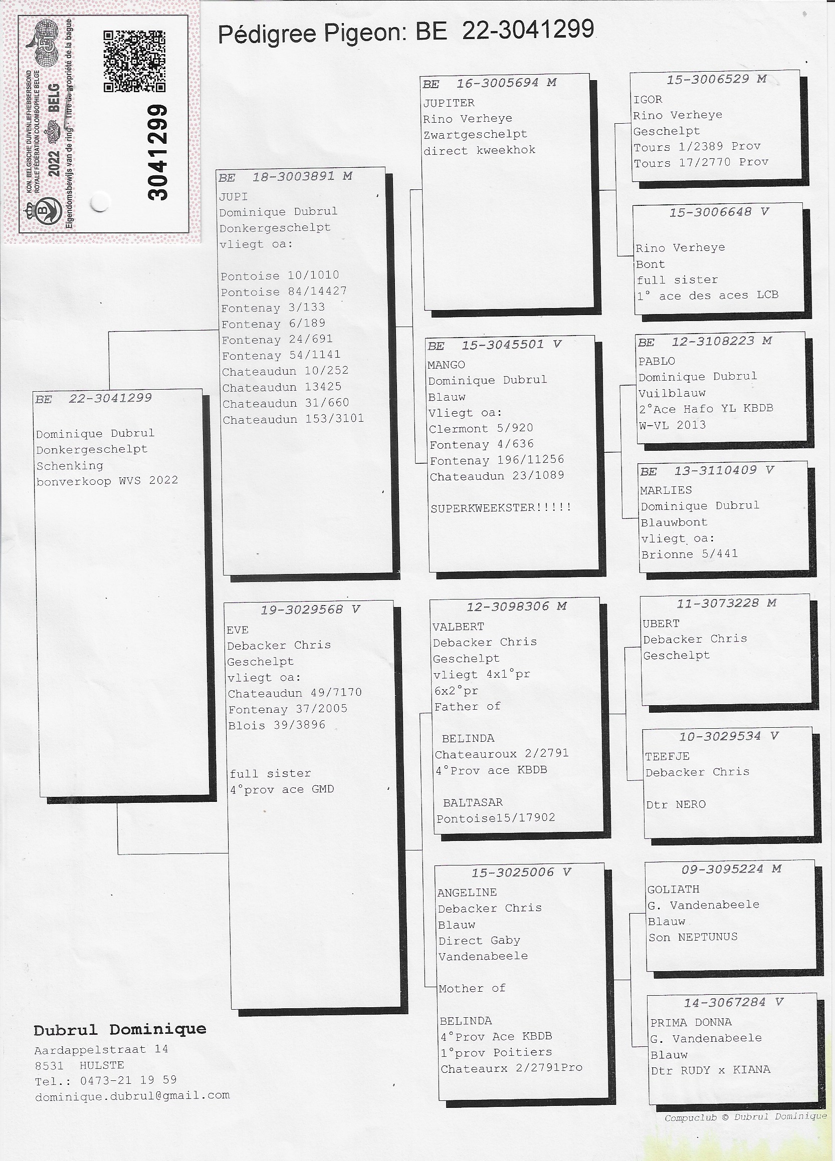 Après une sélection rigoureuse et minutieuse, cette vente comprend tous les pigeons reproducteurs du pigeonnier Vermeiren André & Fils. Il s'agit de races mondiales telles que Chris Debacker, Philippe Dobbelaere, Bert Vanden Berghe, Freddy & Jacques Vandenheede , Guy Van Der Auwera, Gevaert- Lannoo, Luc Deprez, et ce, principalement élevés à partir de vainqueurs provinciaux de 1ère classe ou de la lignée directe de vainqueurs nationaux et provinciaux de 1ère classe qui ont remporté divers classements de haut niveau, de la vitesse au demi-fond difficile. Malheureusement, l'histoire des pigeons à Kruisem touche à sa fin, après le décès du père André fin décembre 2023 et la vente de la maison familiale en 2025. Une aventure qui a commencé en 1979, avec des années de très bons résultats en vitesse et des pigeons de tête classés au niveau provincial comme cerise sur le gâteau. Dans les années 2000, la décision a été prise de passer définitivement au demi-fond et au demi-fond lourd comme nouveau défi. La barre a été placée de plus en plus haut et, en tant qu'amateur « avec le petit panier » face à des colombophiles de renom, cette transition s'est tout de même accompagnée de plusieurs classements dans le top 100 au niveau national et provincial, avec en prime la victoire provinciale à Blois avec « le provincial nestpender 771 », dont plusieurs descendants sont encore en vente. C'est la fin d'une lignée d'élevage soigneusement développée au fil des ans et donc l'occasion de poursuivre le travail de Vermeiren et d'en tirer encore plus de succès!