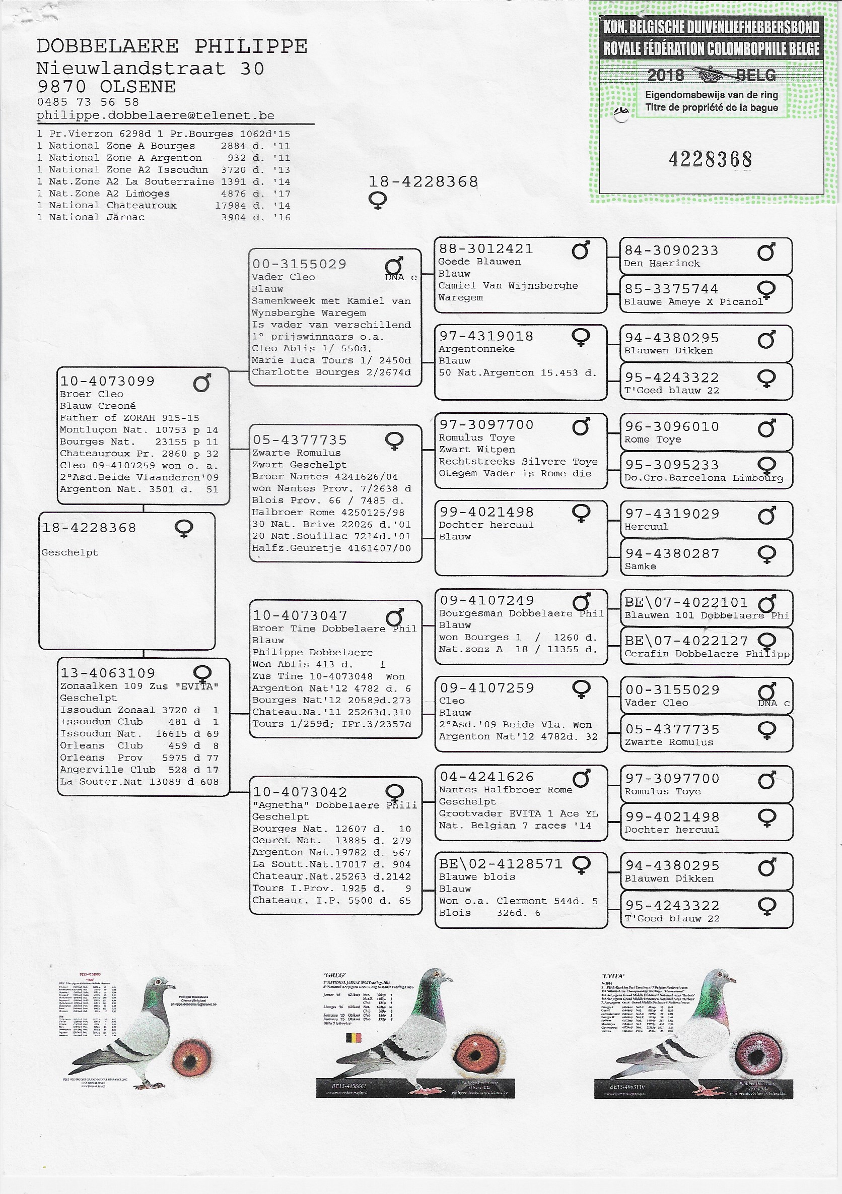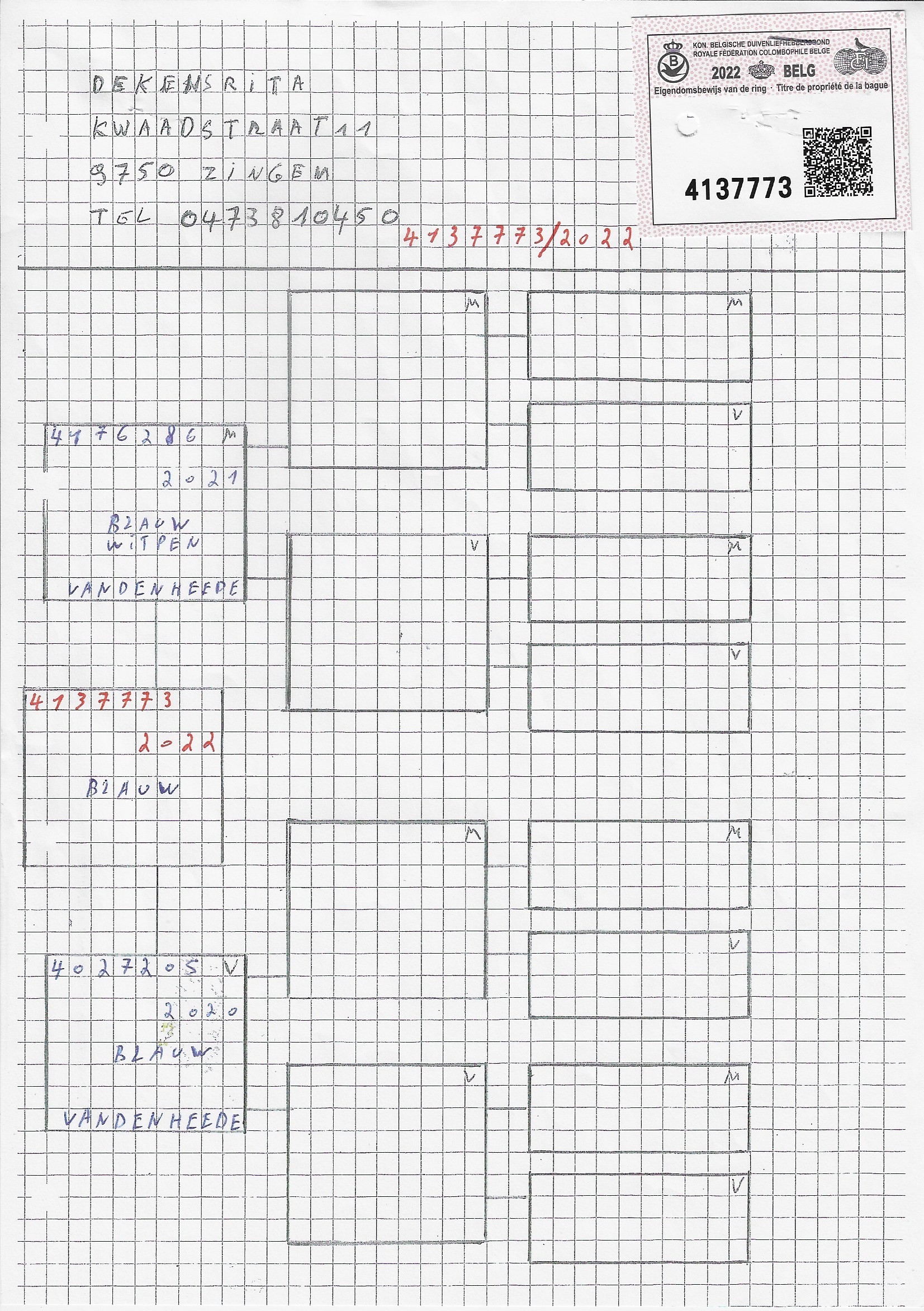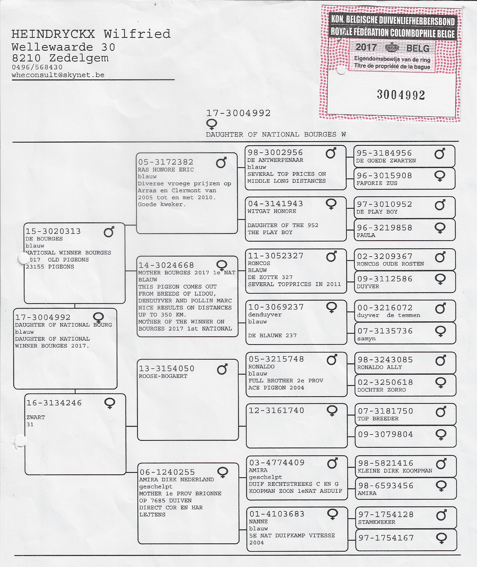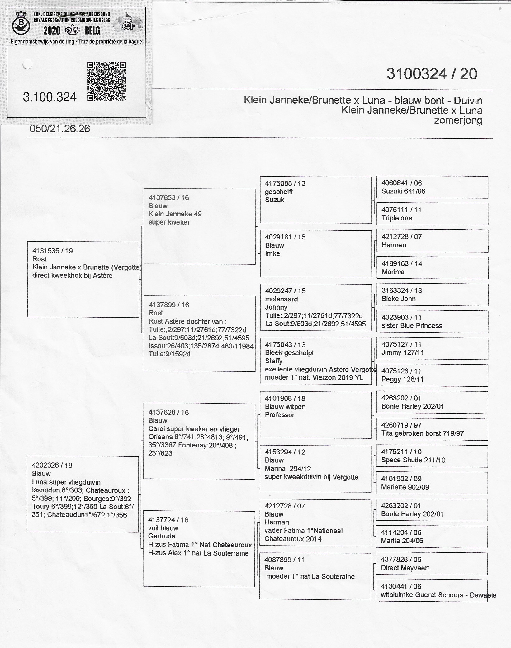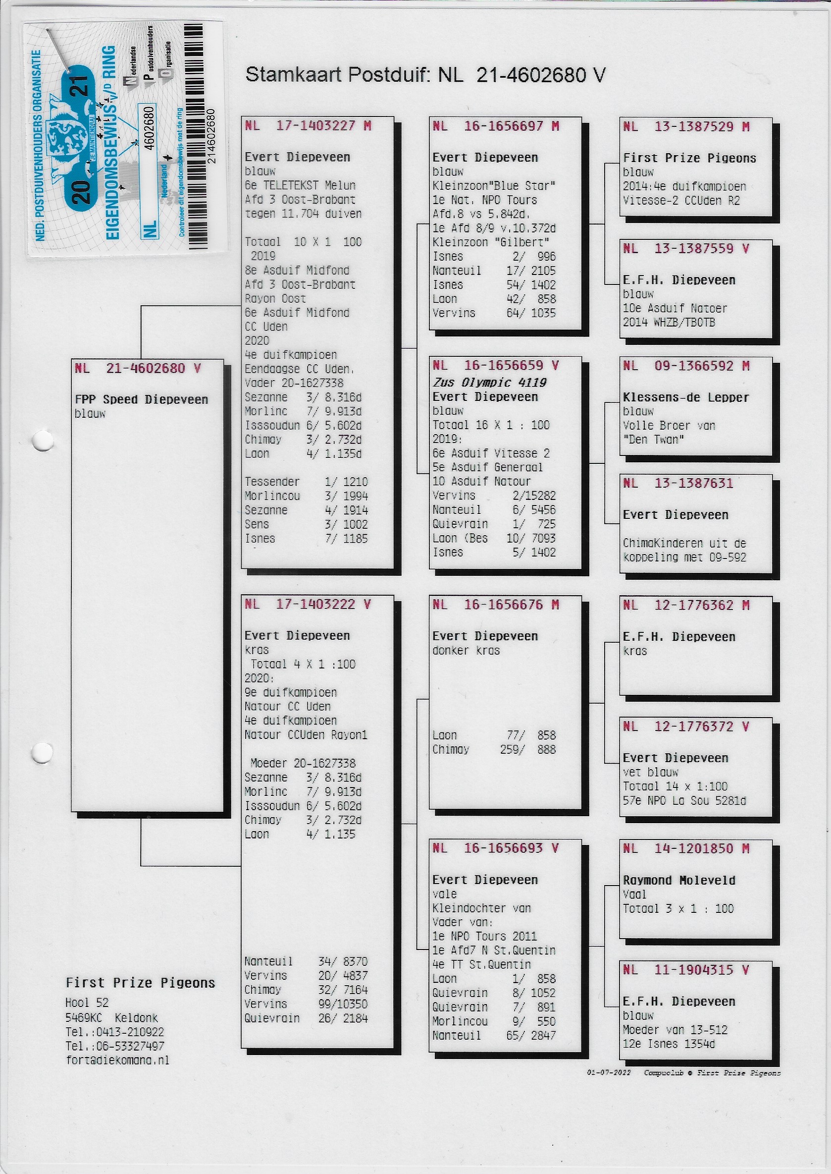 Après une sélection rigoureuse et minutieuse, cette vente comprend tous les pigeons reproducteurs du pigeonnier Vermeiren André & Fils. Il s'agit de races mondiales telles que Chris Debacker, Philippe Dobbelaere, Bert Vanden Berghe, Freddy & Jacques Vandenheede , Guy Van Der Auwera, Gevaert- Lannoo, Luc Deprez, et ce, principalement élevés à partir de vainqueurs provinciaux de 1ère classe ou de la lignée directe de vainqueurs nationaux et provinciaux de 1ère classe qui ont remporté divers classements de haut niveau, de la vitesse au demi-fond difficile. Malheureusement, l'histoire des pigeons à Kruisem touche à sa fin, après le décès du père André fin décembre 2023 et la vente de la maison familiale en 2025. Une aventure qui a commencé en 1979, avec des années de très bons résultats en vitesse et des pigeons de tête classés au niveau provincial comme cerise sur le gâteau. Dans les années 2000, la décision a été prise de passer définitivement au demi-fond et au demi-fond lourd comme nouveau défi. La barre a été placée de plus en plus haut et, en tant qu'amateur « avec le petit panier » face à des colombophiles de renom, cette transition s'est tout de même accompagnée de plusieurs classements dans le top 100 au niveau national et provincial, avec en prime la victoire provinciale à Blois avec « le provincial nestpender 771 », dont plusieurs descendants sont encore en vente. C'est la fin d'une lignée d'élevage soigneusement développée au fil des ans et donc l'occasion de poursuivre le travail de Vermeiren et d'en tirer encore plus de succès!
