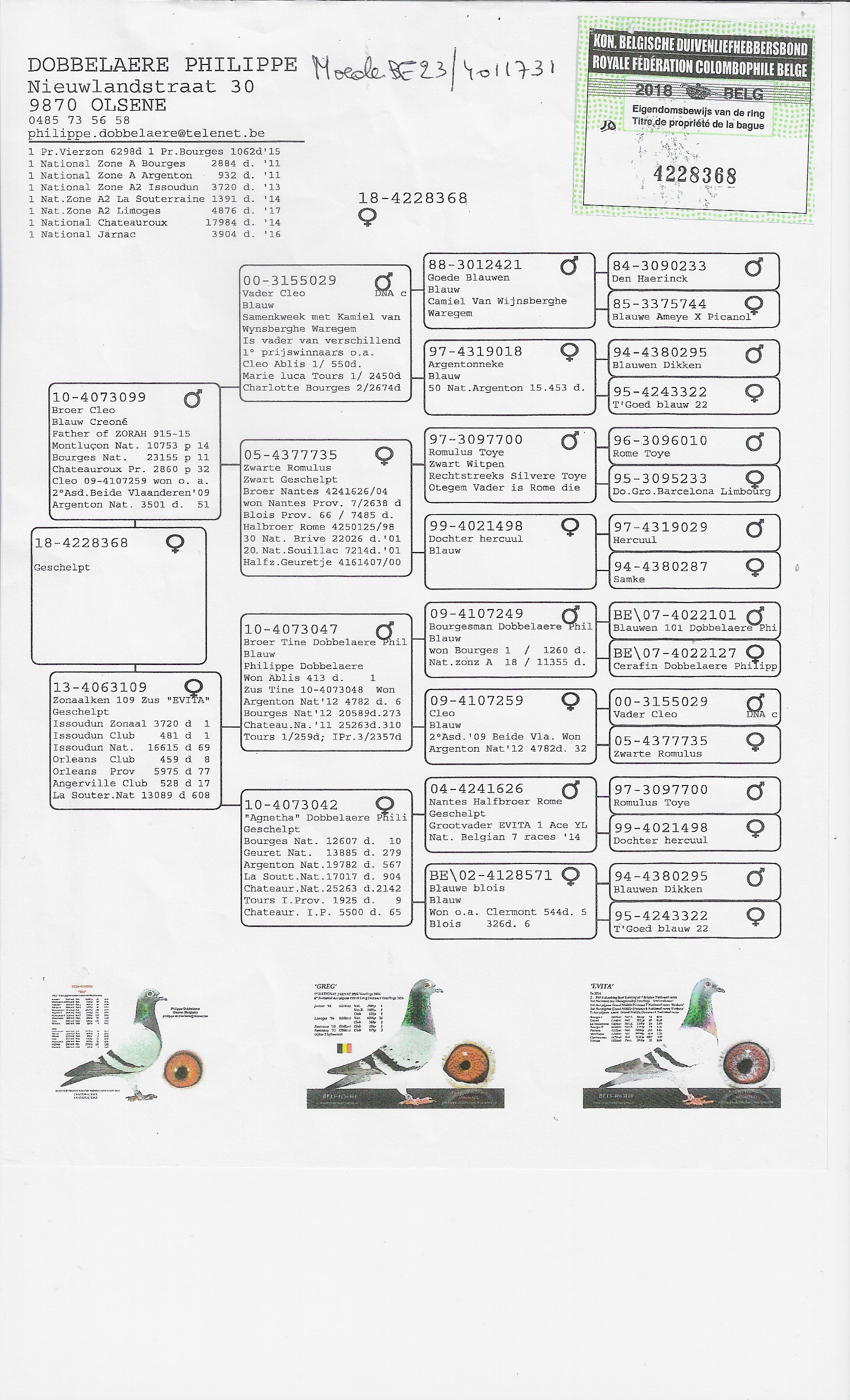 Mother: Directly from top breeder Philippe Dobbelaere (Olsene). She comes from Zonaalken 109 × Brother Cleo, a breeding pair whose offspring achieved top results such as: