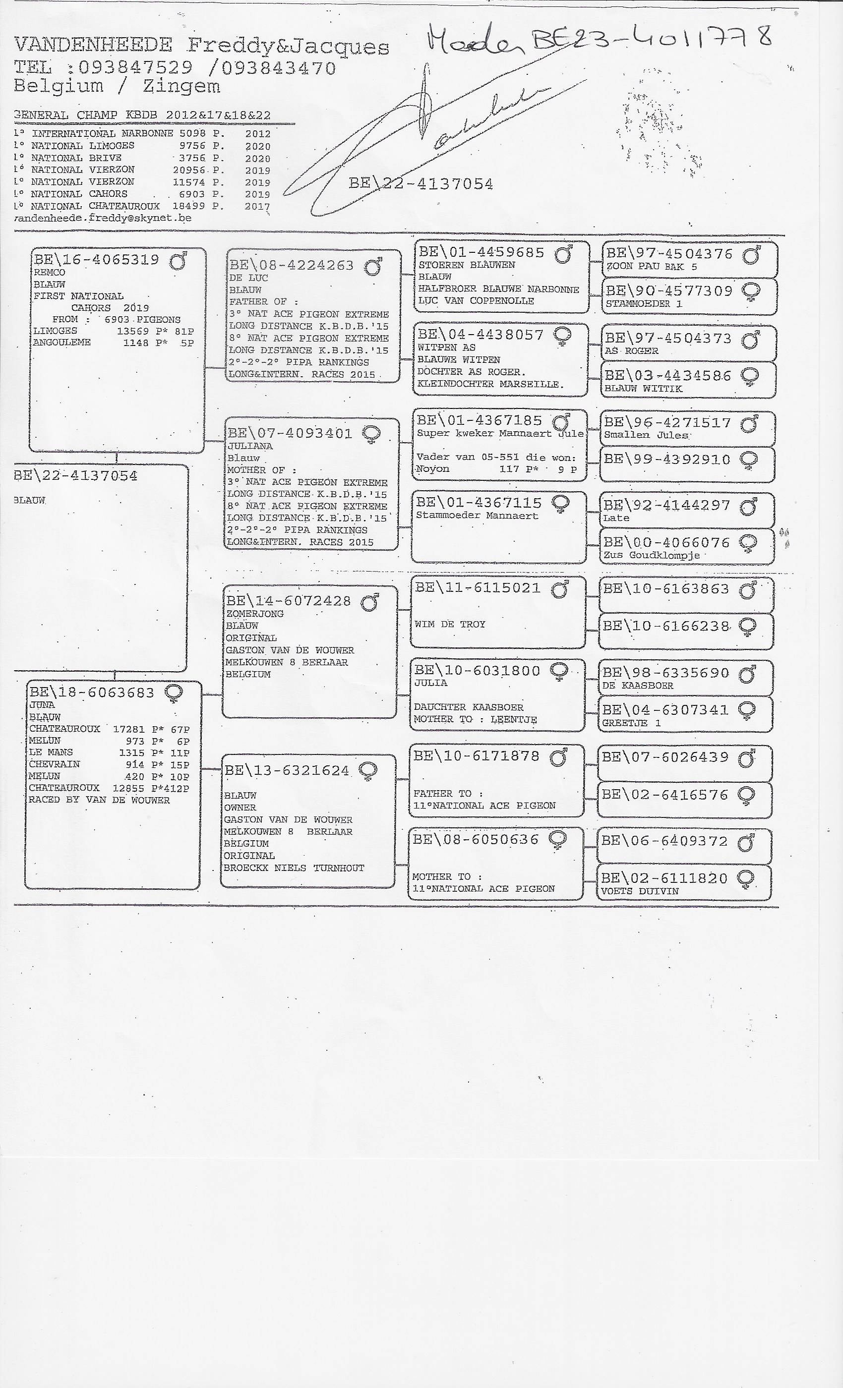 Additionally, he is a full brother of the 33rd National Poitiers. He descends from the world-famous Limoges line of Rauw-Sablon, known for top performers such as Marsipulami I & II (2nd & 4th Nat. Ace Pigeon Extreme Long Distance for Freddy & Jacques Vandenheede). International lofts such as Flanders Collection, Erik Limbourg, Marcel Aelbrecht, and Marcel Sangers also achieve exceptional results with this bloodline.