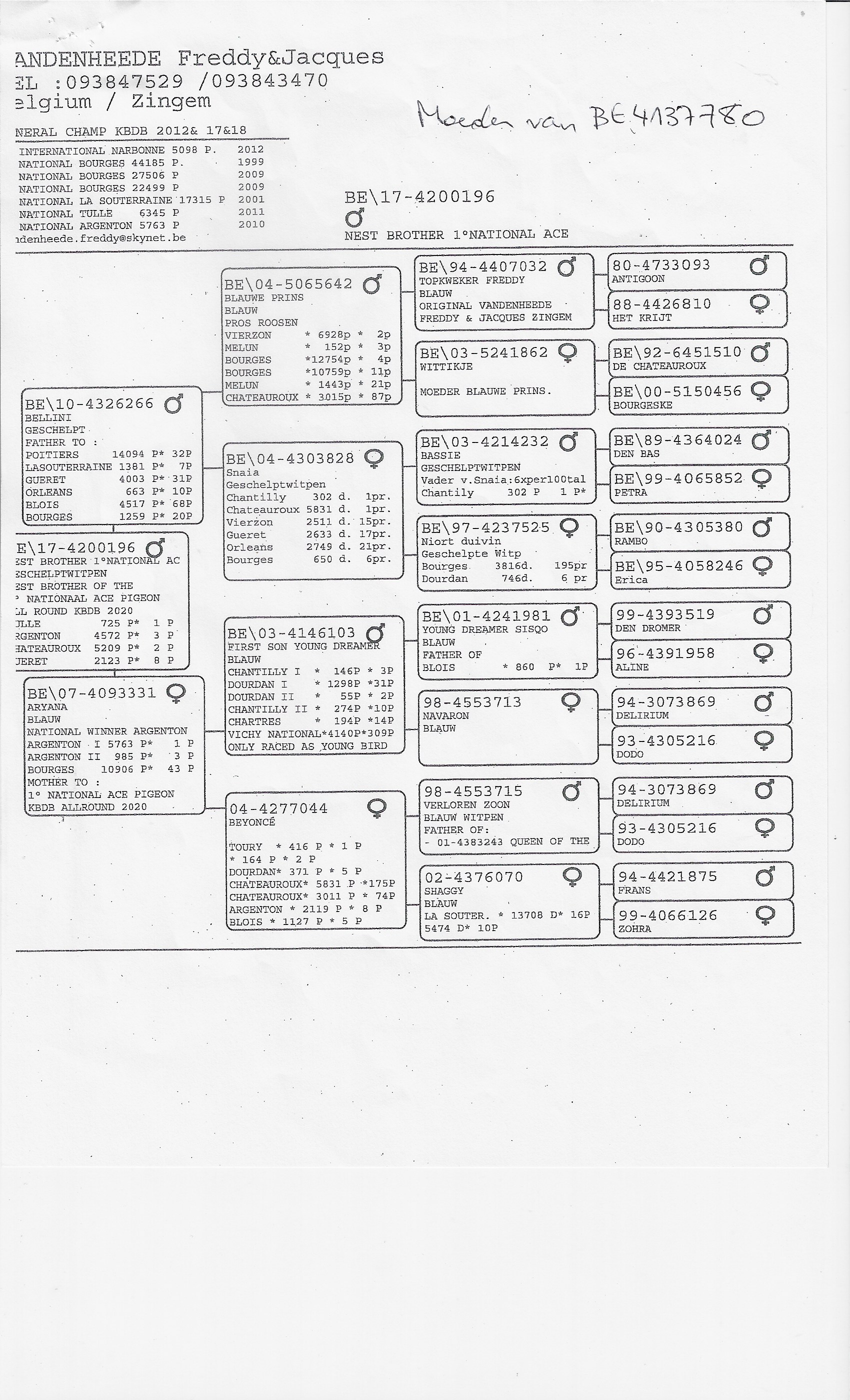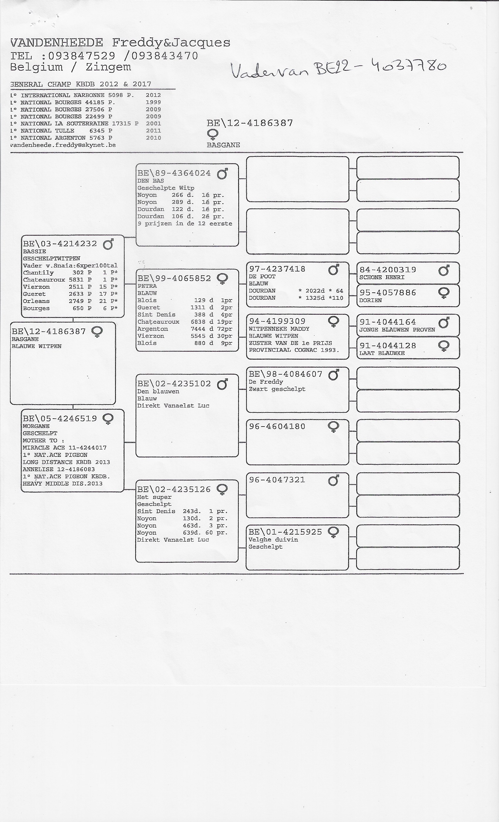 Annelise – 1st National Ace Pigeon Long Middle Distance KBDB 2013; Poitiers: 1st Provincial (3,845 birds), Vierzon: 1st Provincial (2,982 birds), and Best Yearling of Belgium over 7 national races in 2013 (PIPA)