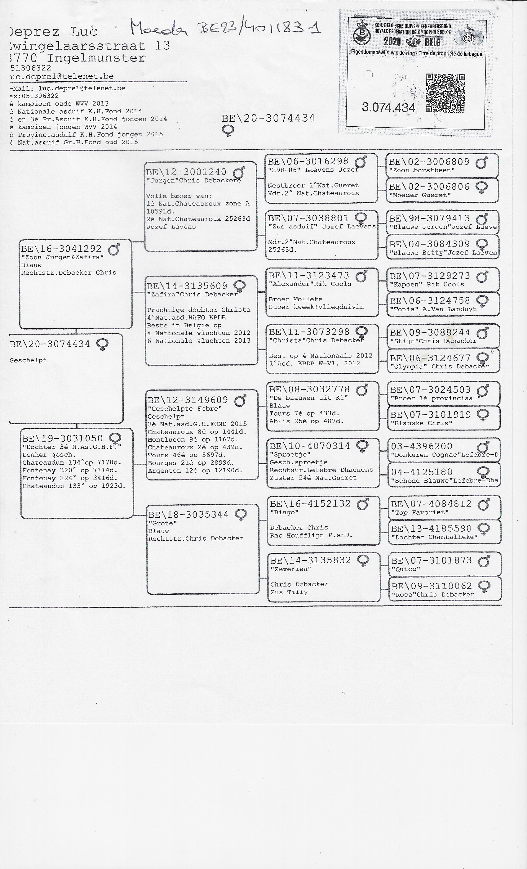 Paternal side: 100% Chris Debacker, Beveren-Leie, from a son who is full brother to 1st National Châteauroux 10,591 birds and 2nd National Châteauroux 25,263 birds, with a daughter of Christa, 4th National Ace Pigeon Heavy Middle Distance KBDB