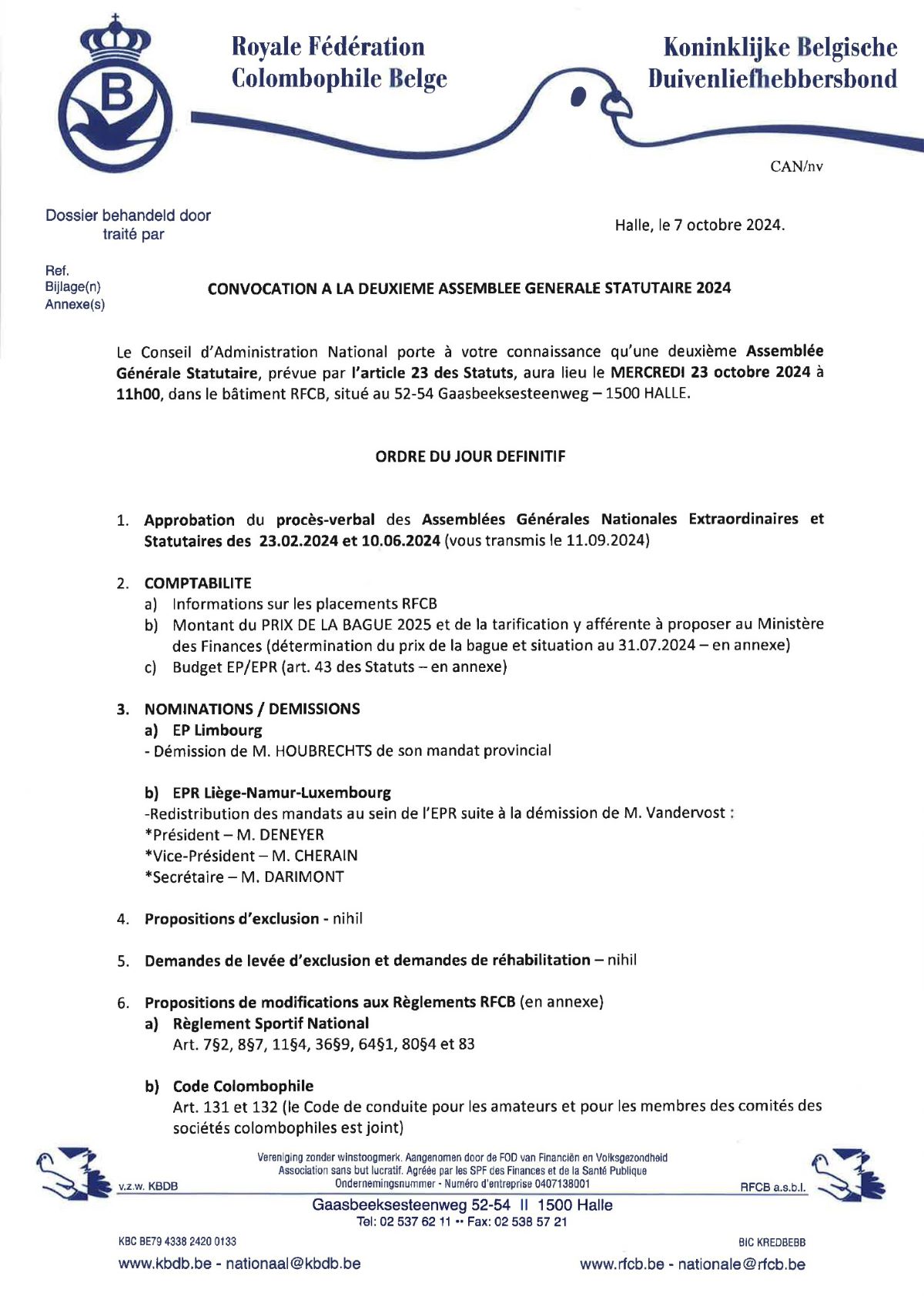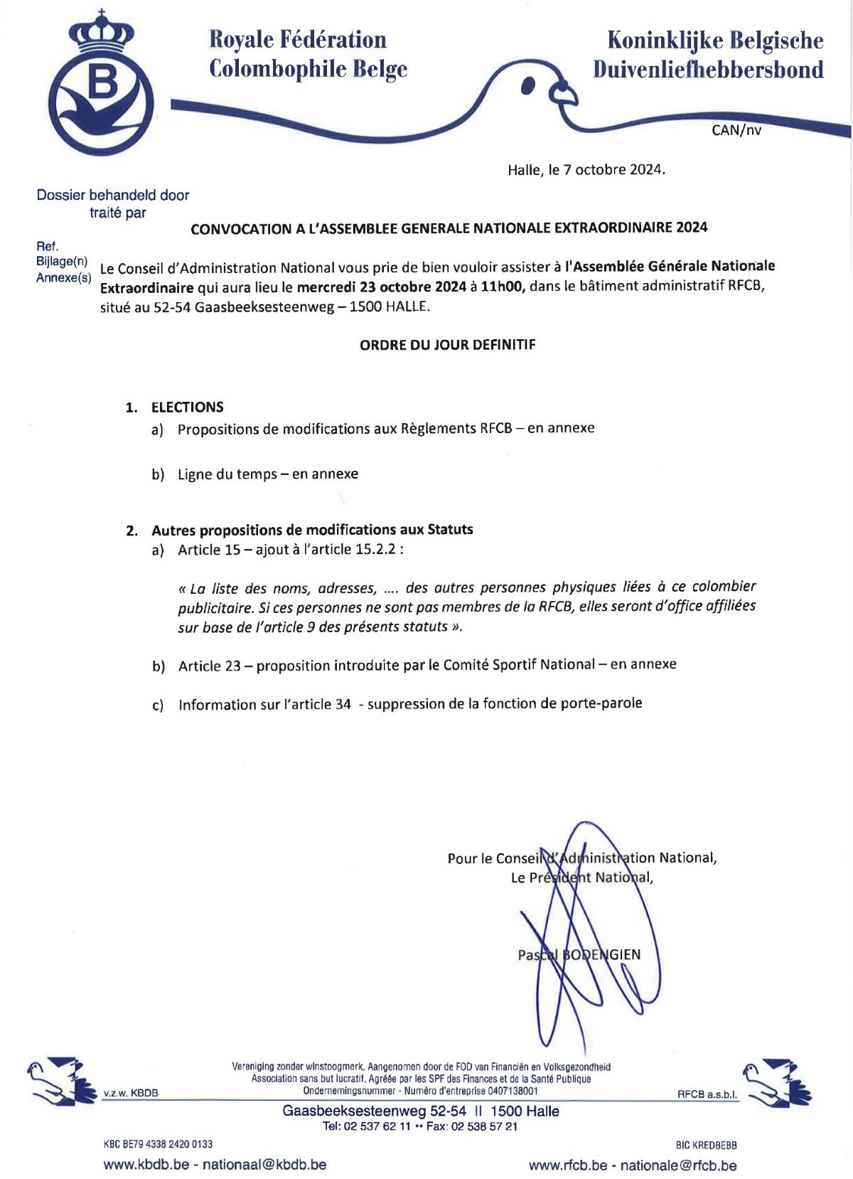 Communiqué de la RFCB – Assemblée Générale Nationale 23-10-2024 Ordre du jour AGE & Ordre du jour AGN