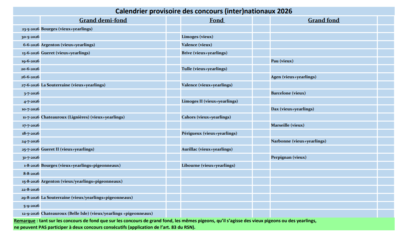 Protection des pigeonneaux : Seules quatre épreuves nationales de Grand Demi-Fond sont prévues, espacées de quatorze jours. Cette limitation garantit une charge raisonnable et une progression adaptée.