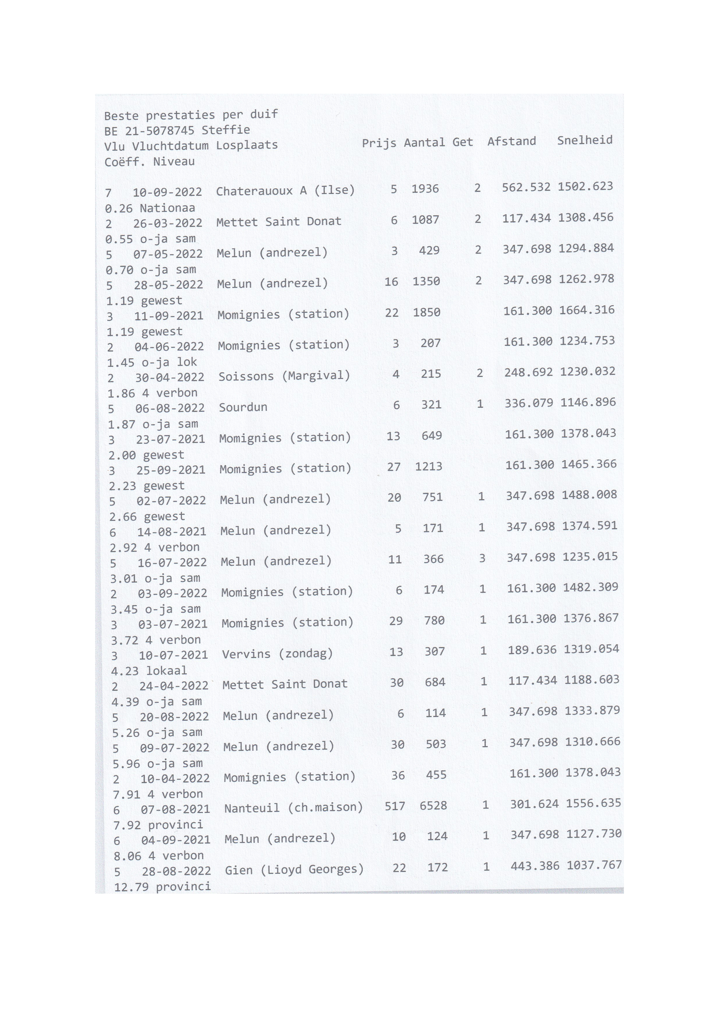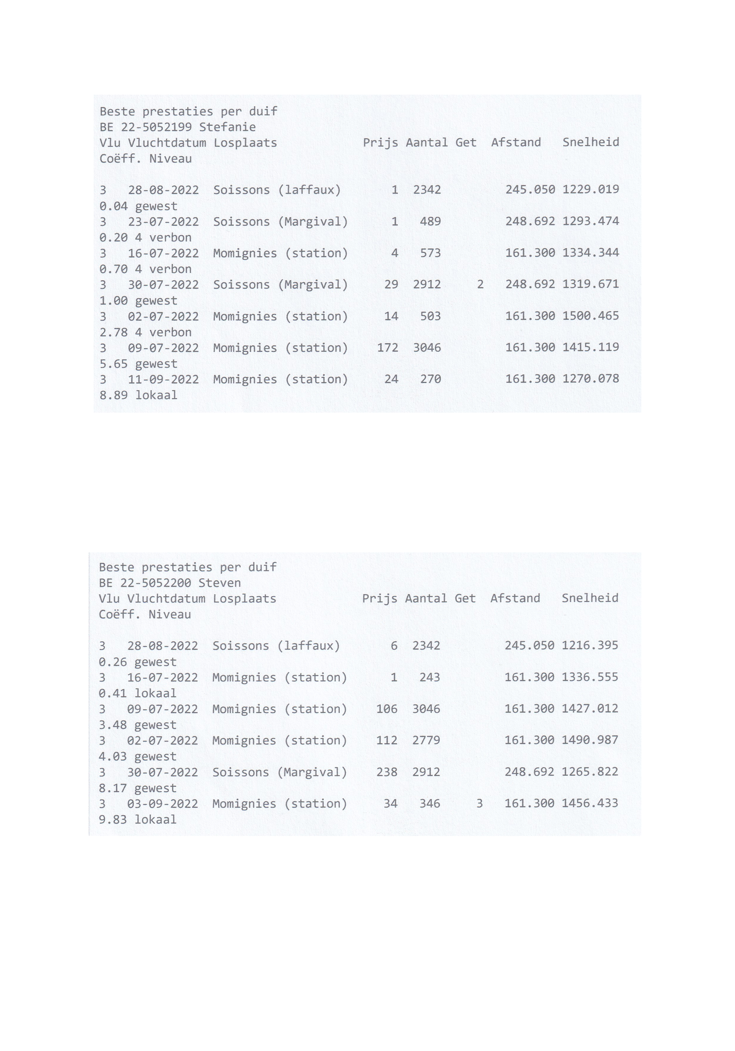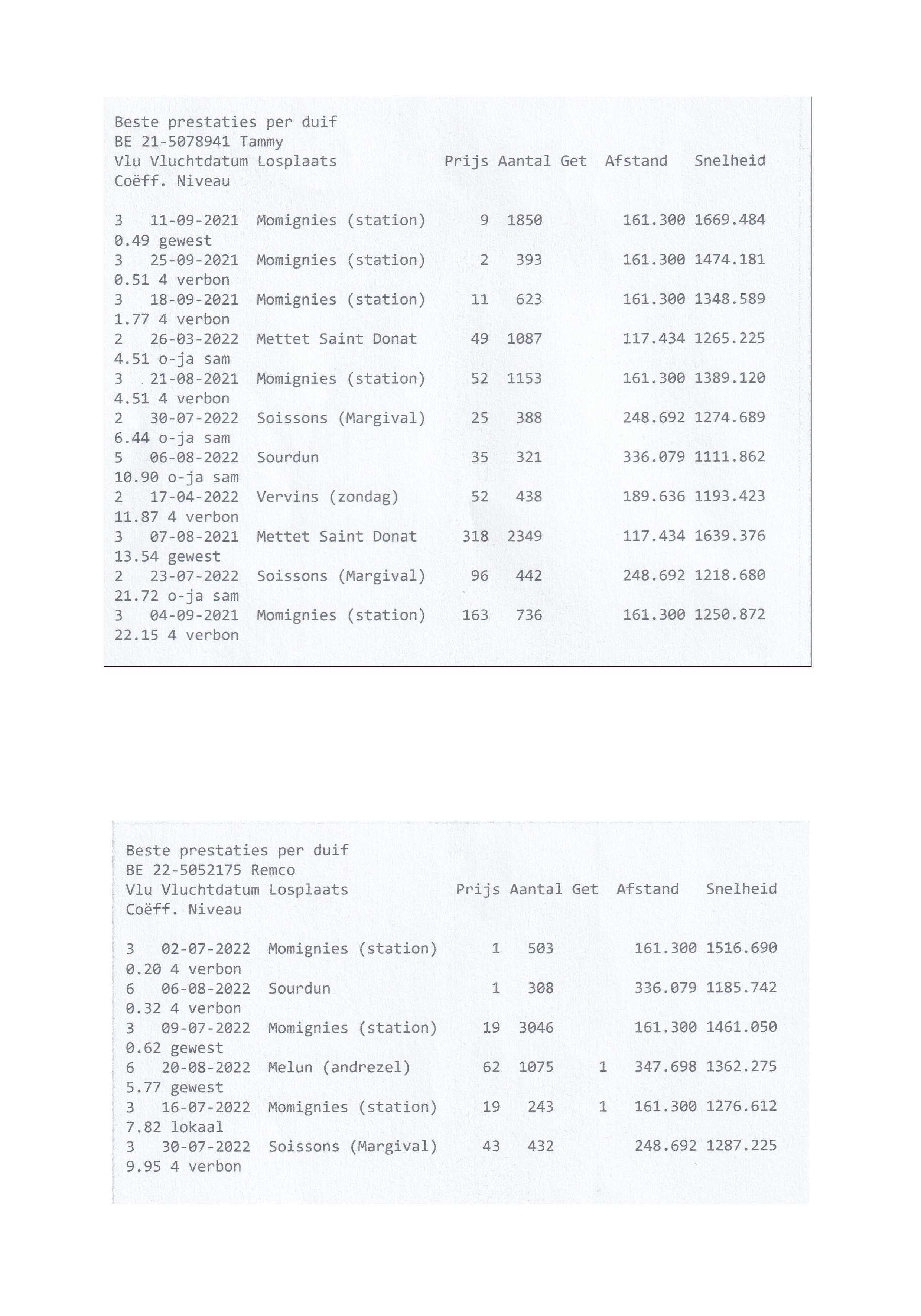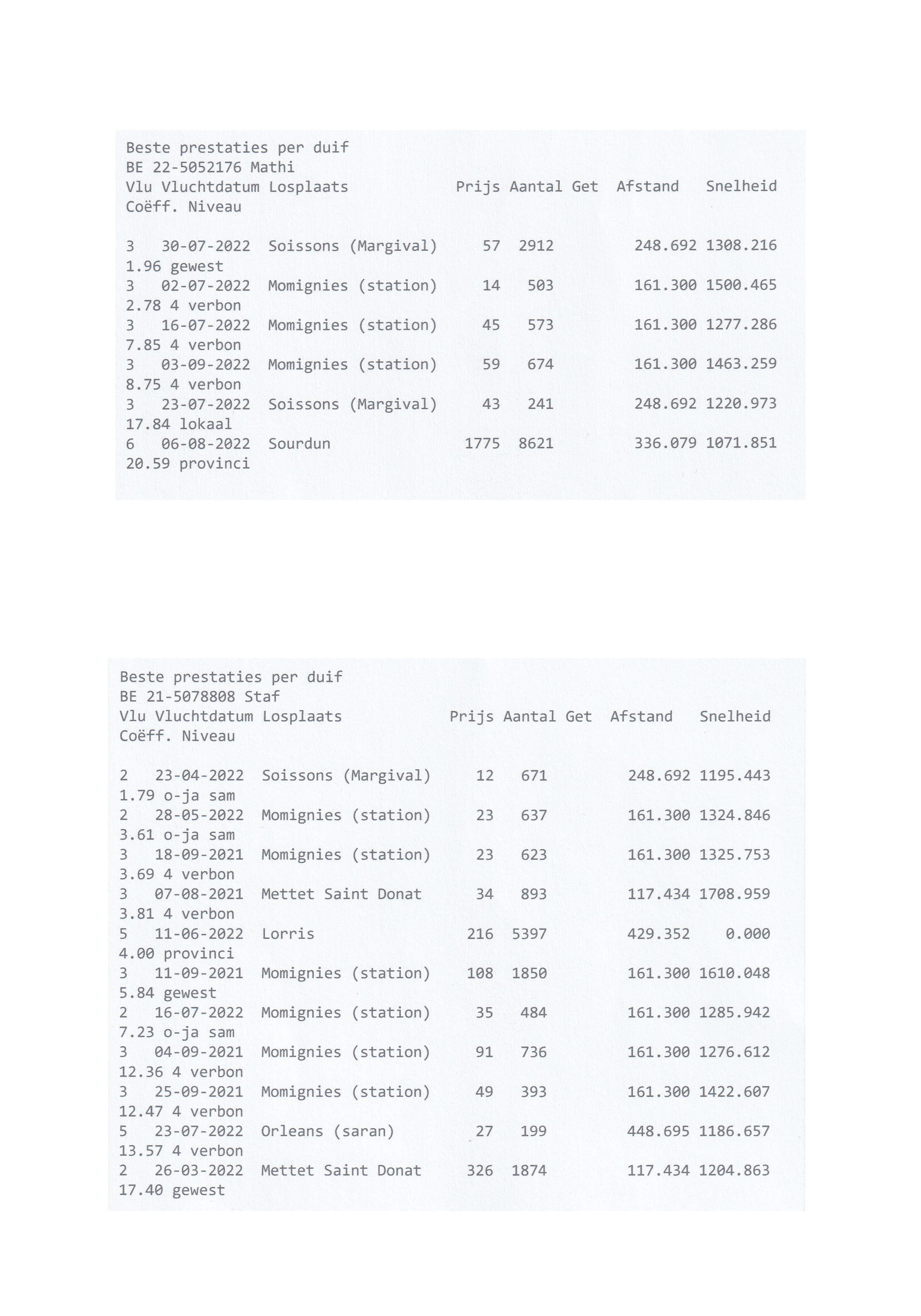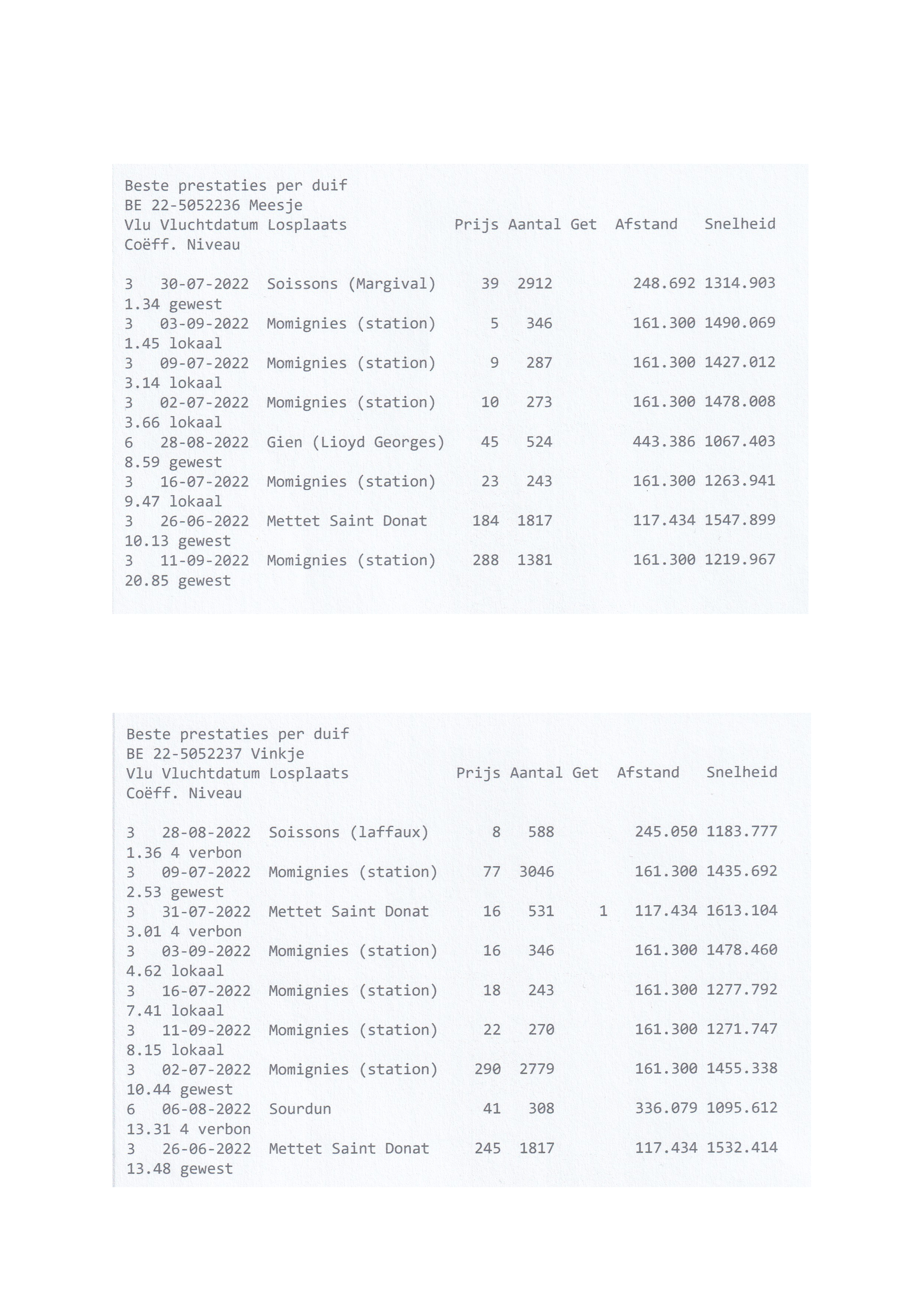 Nous allons aussi volontiers vous donner quelques résultats, en grande partie remportés par des frères et sœurs de pigeons qui se trouveront dans la vente publique.