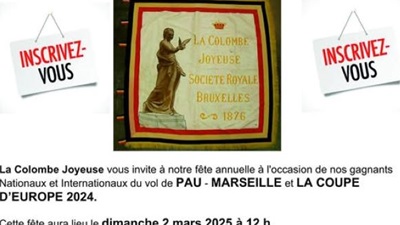 Fête annuelle de la Colombe Joyeuse - Vainqueurs Prov. - Nationale - Internationale de PAU - MARSEILLE - COUPE D'EUROPE & AS-PIGEONS 2024. Inscrivez-vous ! - Dimanche 2 Mars 2025 12h Salle de Fête DE KEIRK - AALST (BE) - info@colombejoyeuse.be