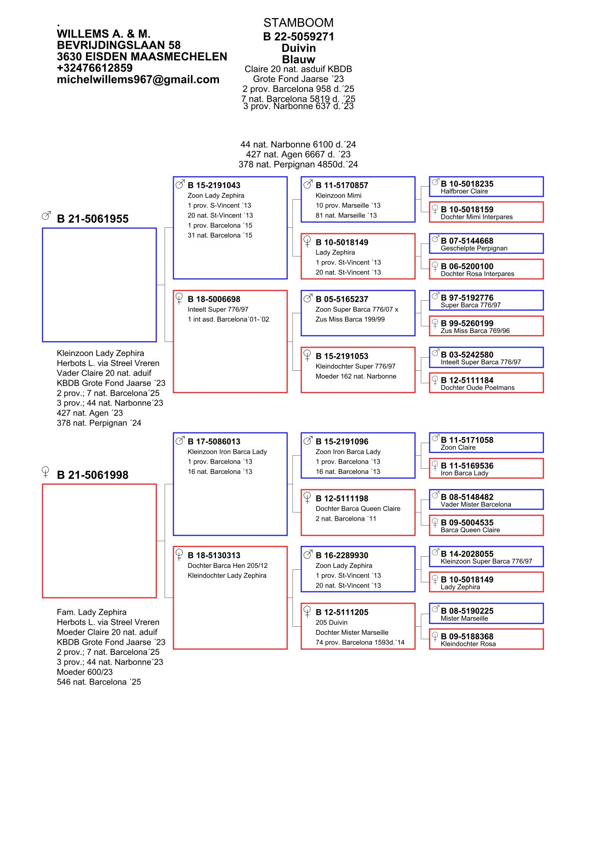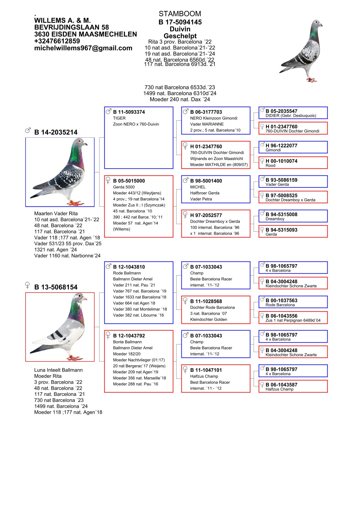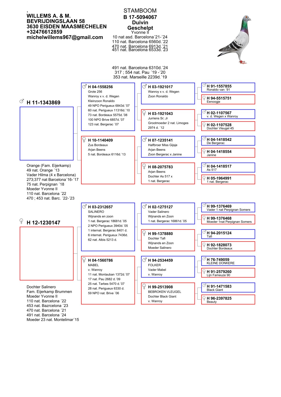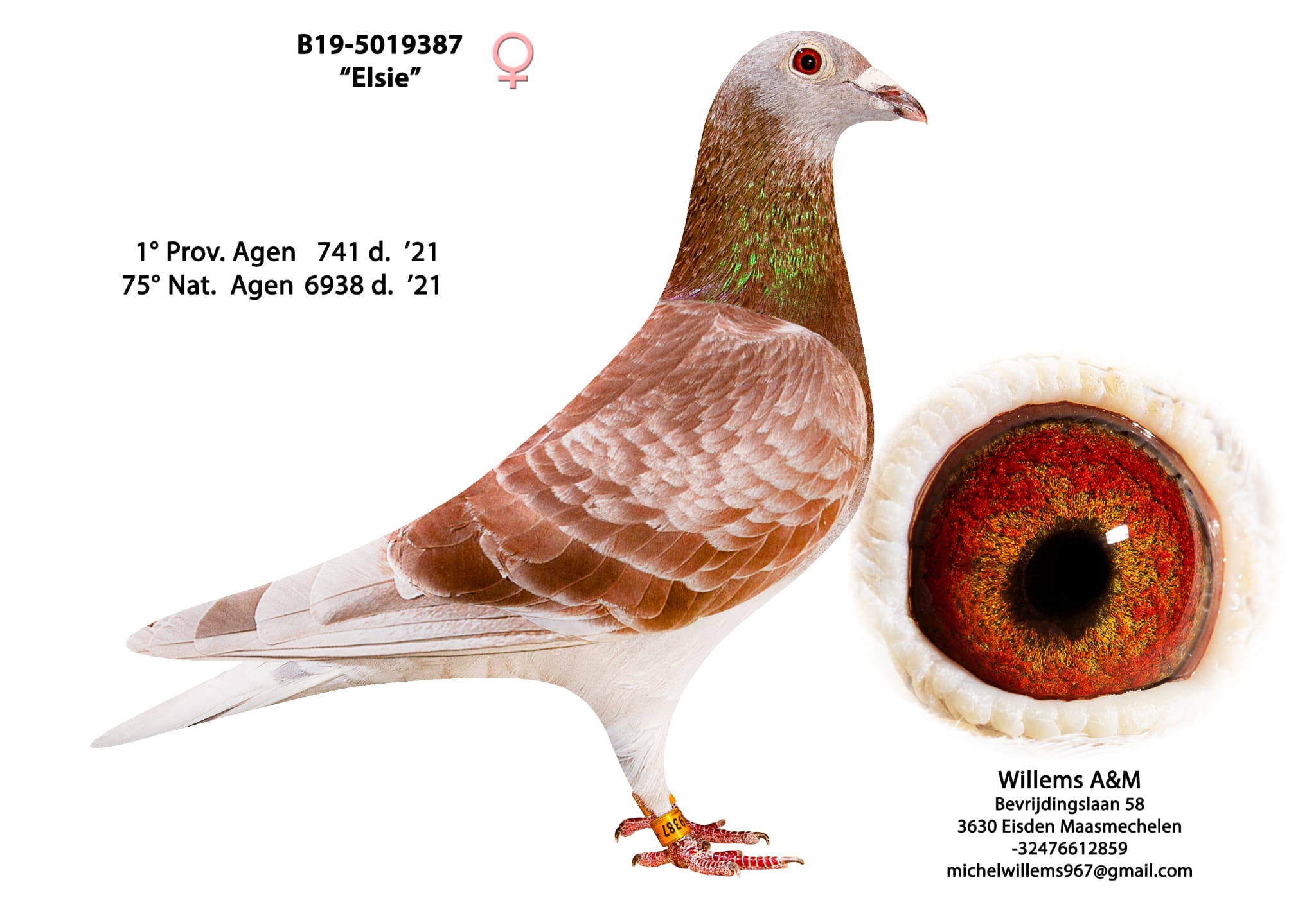 Ook deze duivin kan je terugvinden in de pedigrees van de aangeboden duiven. Zij maken er ieder jaar een erezaak van om voor PITTS een zeer uitgeselecteerde, kwalitatieve groep te kunnen aanbieden. Duiven voor het pure zware werk die al decennia lang bewezen hebben wat zij in hun mars hebben. Je kan overigens zien in de afstammingen van de aangeboden duiven dat er veel Nederlands fondbloed in zit, met oa de inbreng van Batenburg-Van de Merwe, Cor de Heijde, Jellema... Nederlands zware fondbloed gekruist met hun toppers, het werpt de laatste jaren weer enorm zijn vruchten af ten huize Willems.