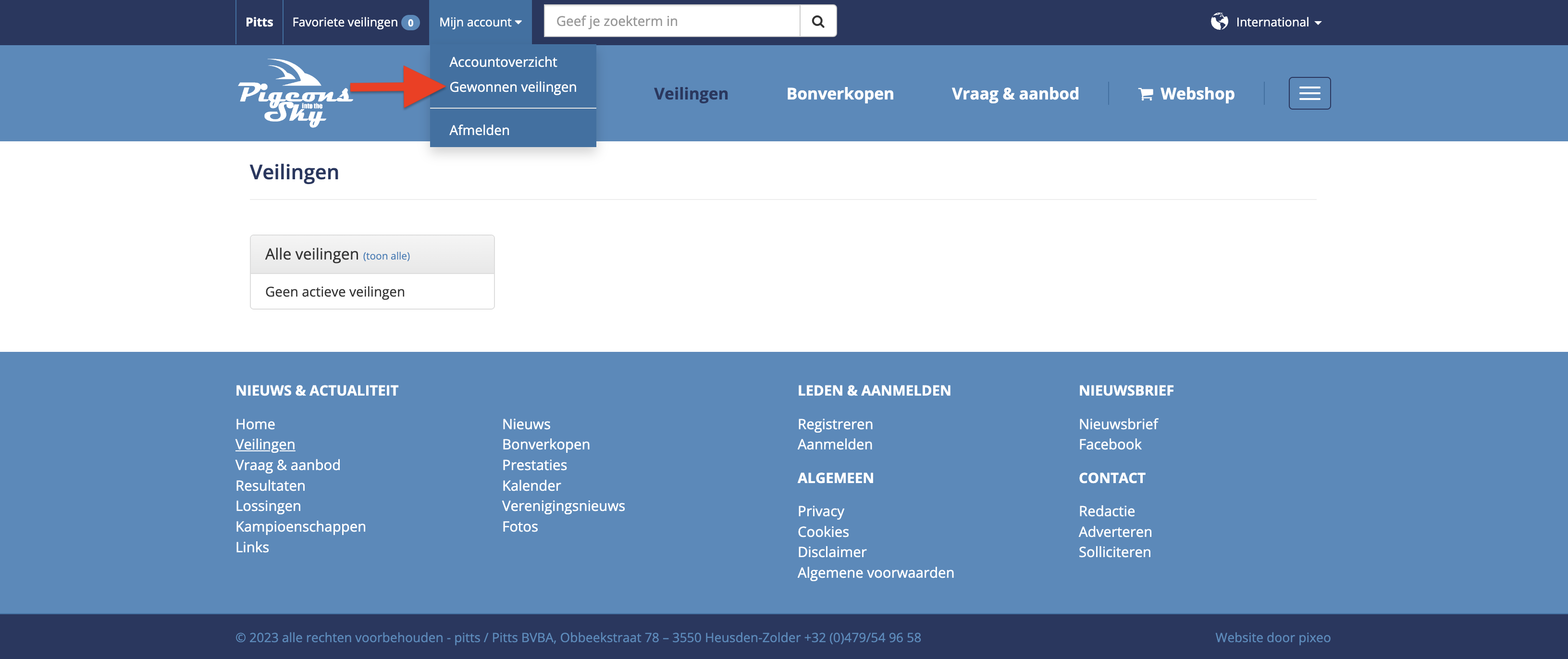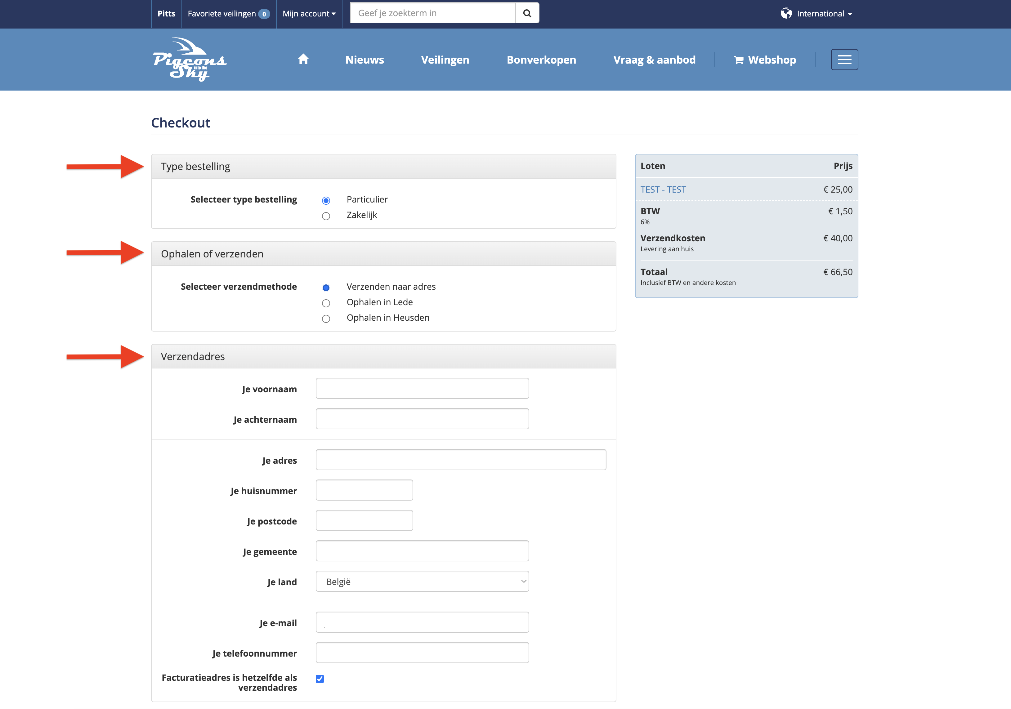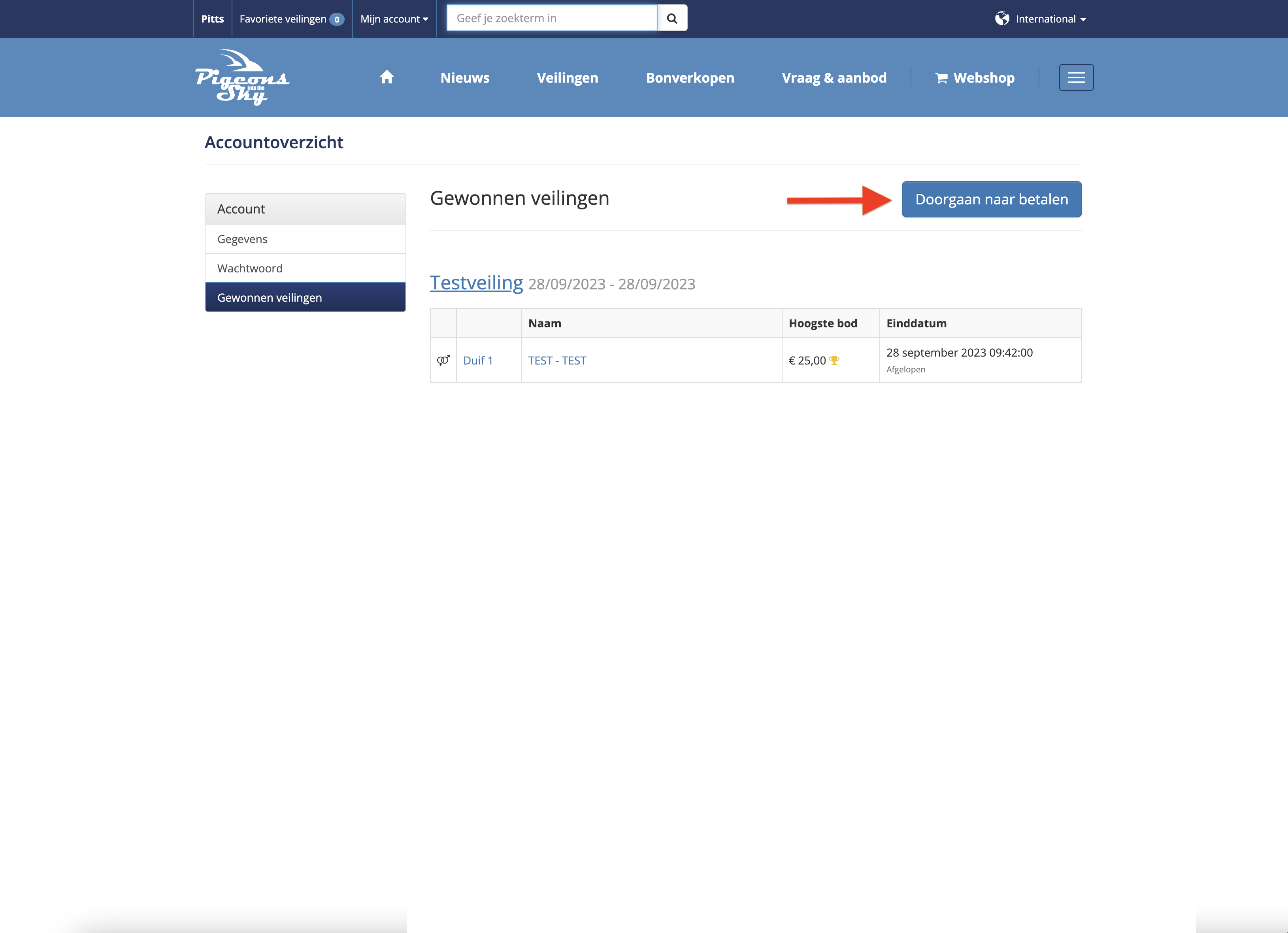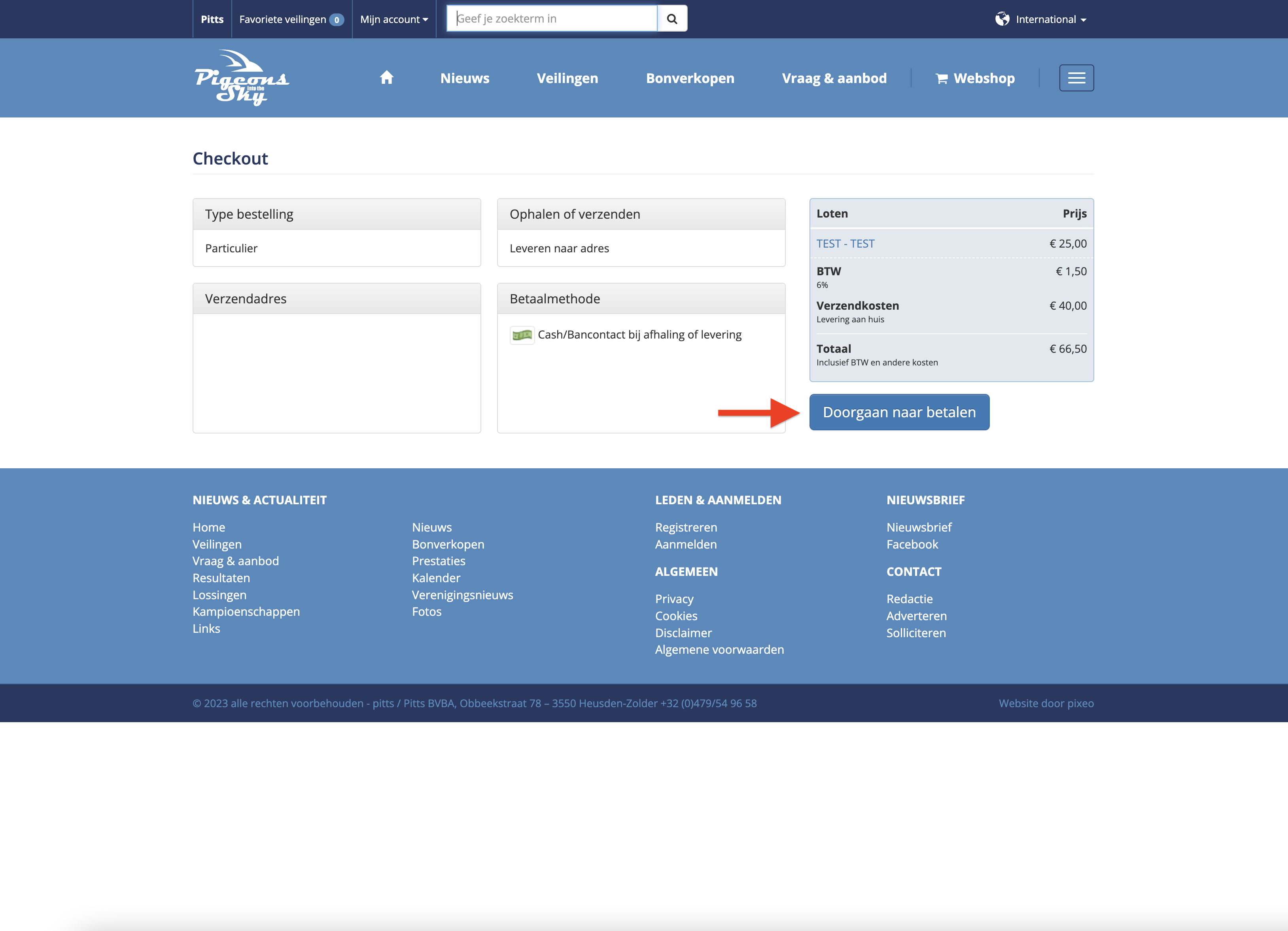 Wanneer u in uw account naar “Gewonnen veilingen” gaat, zal u daar een knop zien “Doorgaan naar betalen” en vervolgens komt u op uw persoonlijke “checkout” pagina terecht.