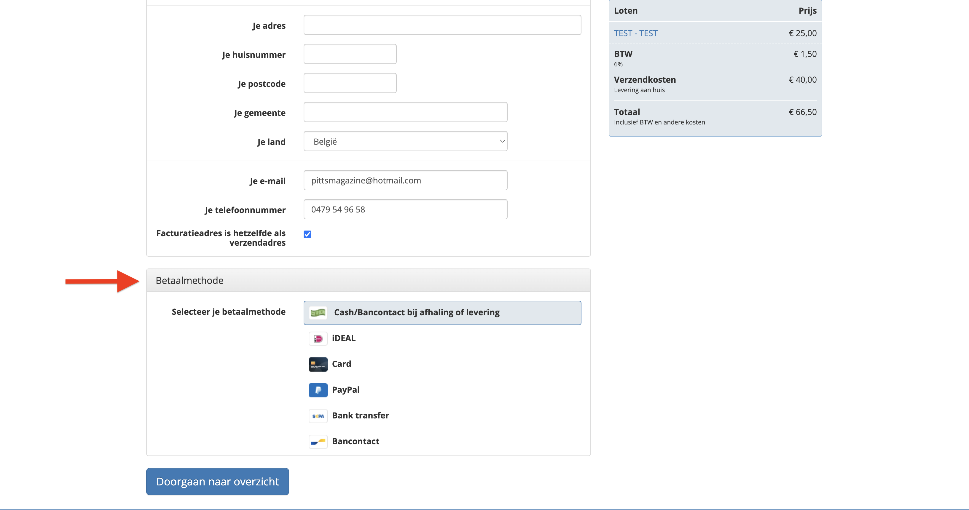 Wanneer u alle gegevens heeft ingevuld gaat u via de knop "Doorgaan naar overzicht" verder naar de overzichtspagina waar u controleert of alle gegevens juist zijn. Hierna zal u via "Doorgaan naar betalen" doorgestuurd worden naar onze betaalpartner of indien u de keuze "Cash/bancontact bij afhaling of levering" heeft gemaakt naar de bevestigingspagina gaan.