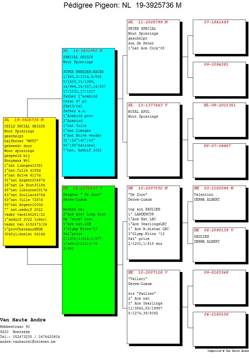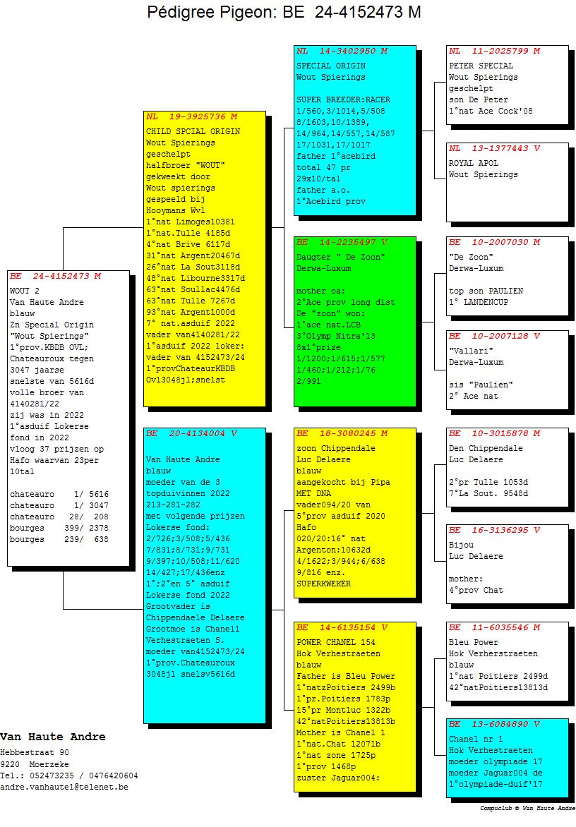 Vader : "Wout 2" is halfbroer van "Wout" NL 3926736/19 gekweekt door Wout Spierings en gespeeld bij Hooymans