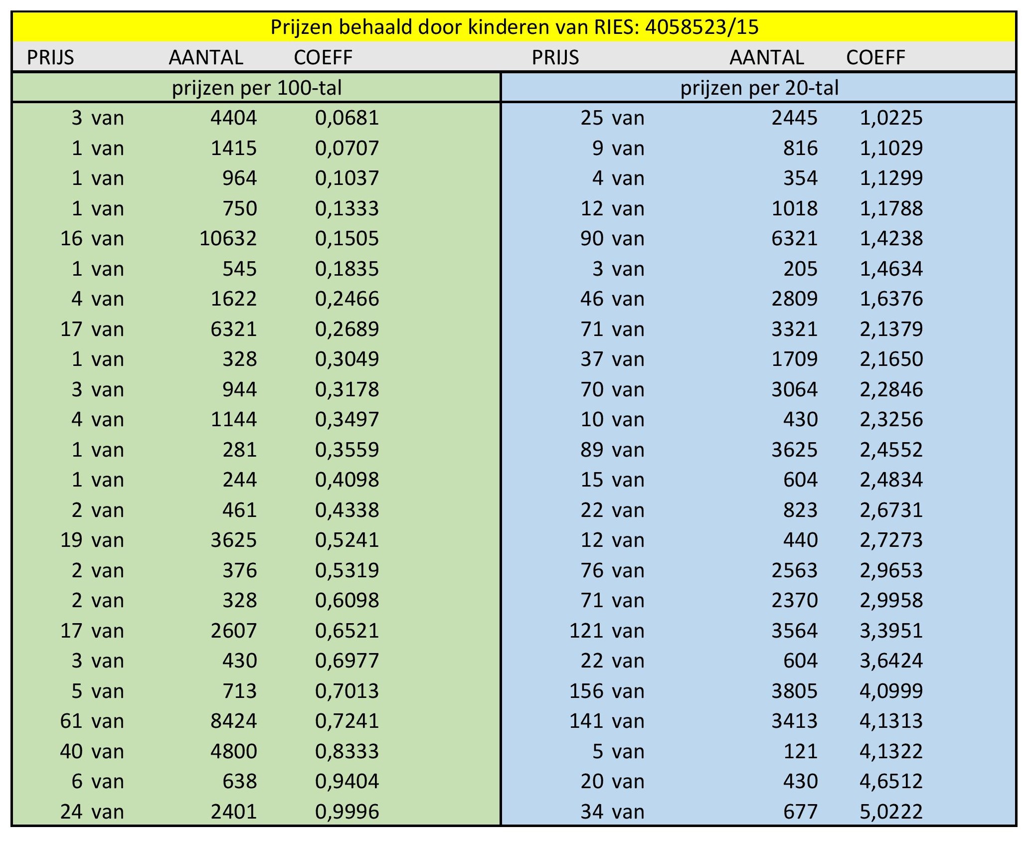 Kinderen van “RIES”, zo goed als alle kinderen van deze duivin presteren enorm goed, zowel op de vluchten als op de kweek. Vele liefhebbers zijn reeds aardig gelukt met haar kinderen en kleinkinderen.