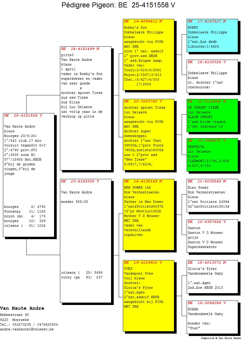 Als jonge duif enkel geleerd, dit jaar via Quiévrain, Noyon en kleine halve fond voor het eerst gespeeld op de zware halve fond met als resultaat 1° provinciaal KBDB OVL jaarse tegen 3048 duiven en snelste van 5616d uit Chateauroux
