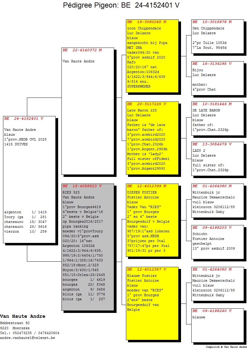 Voor Andre begon het duivenavontuur reeds in 1972. Terwijl hij eigenlijk jarenlang gekend was als snelheidsvirtuoos, koos hij vanaf 2013-2014 ook voor de halve fond en zware halve fond. Intussen vinden we wekelijks zijn naam terug op de bovenste lijntjes van de uitslagen, en dit van pure vitesse tot dagfond! De rassen die hiervoor verantwoordelijk zijn, zijn logischerwijze dan ook niet de minste. Er werden in de laatste jaren kosten nog moeite gespaard om toppers binnen te halen van wereldhokken en dit duidelijk met succes!