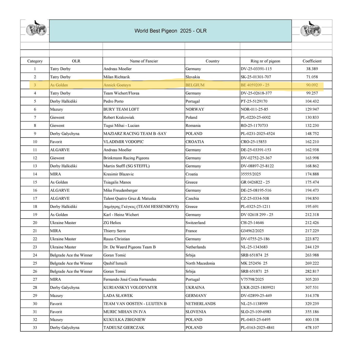 3e WORLD BEST PIGEON OLR 2025