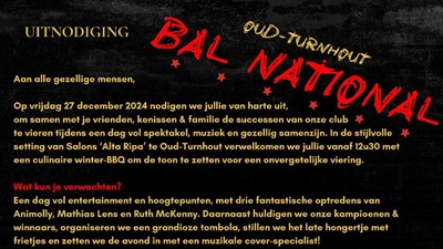 Op vrijdag 27 december 2024 nodigen we jullie van harte uit, om samen met je vrienden, kenissen & familie de successen van onze club te vieren tijdens een dag volg spektakel, muziek en gezellig samenzijn. In de stijlvolle setting van Salons 'Alta Ripa' te Oud-Turnhout we jullie.