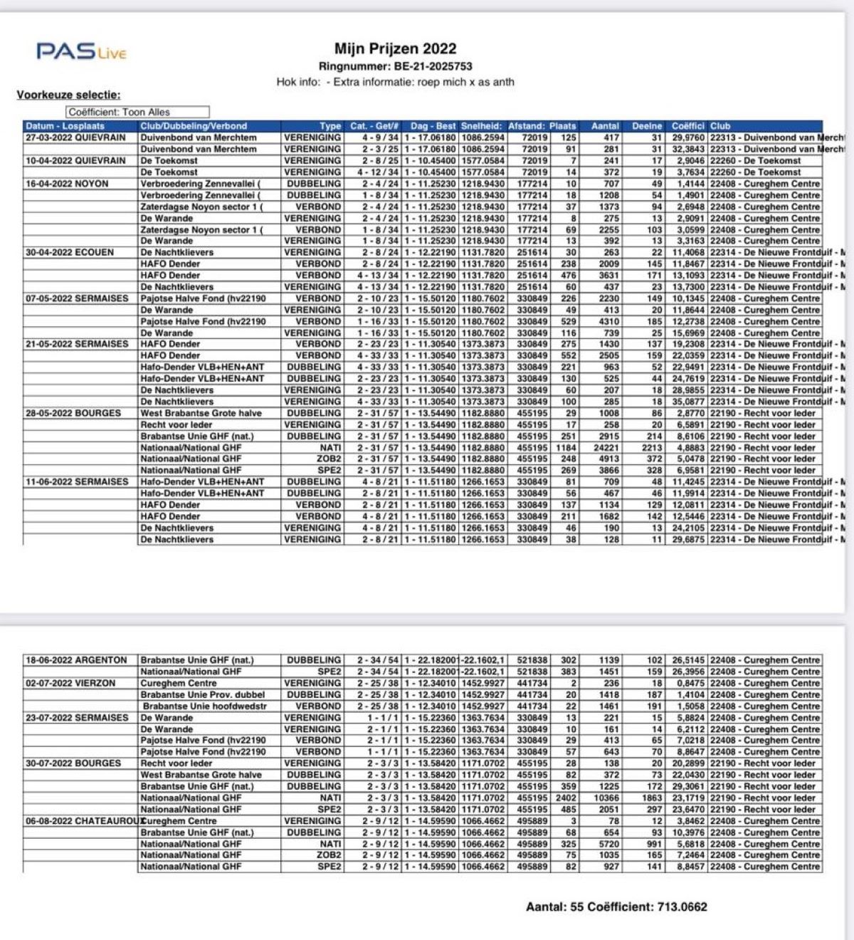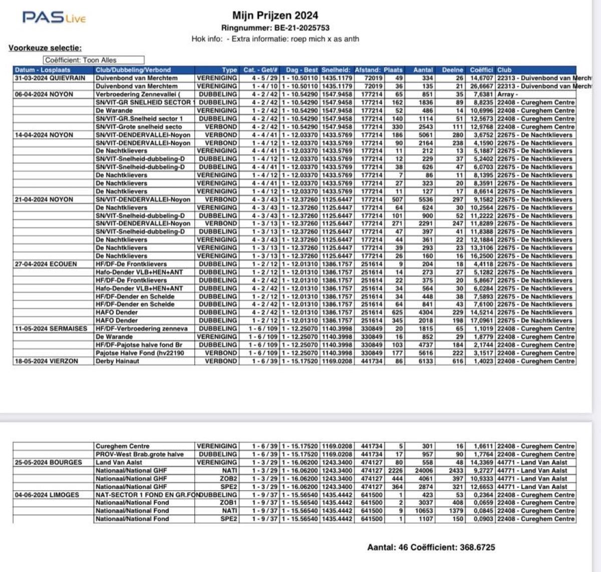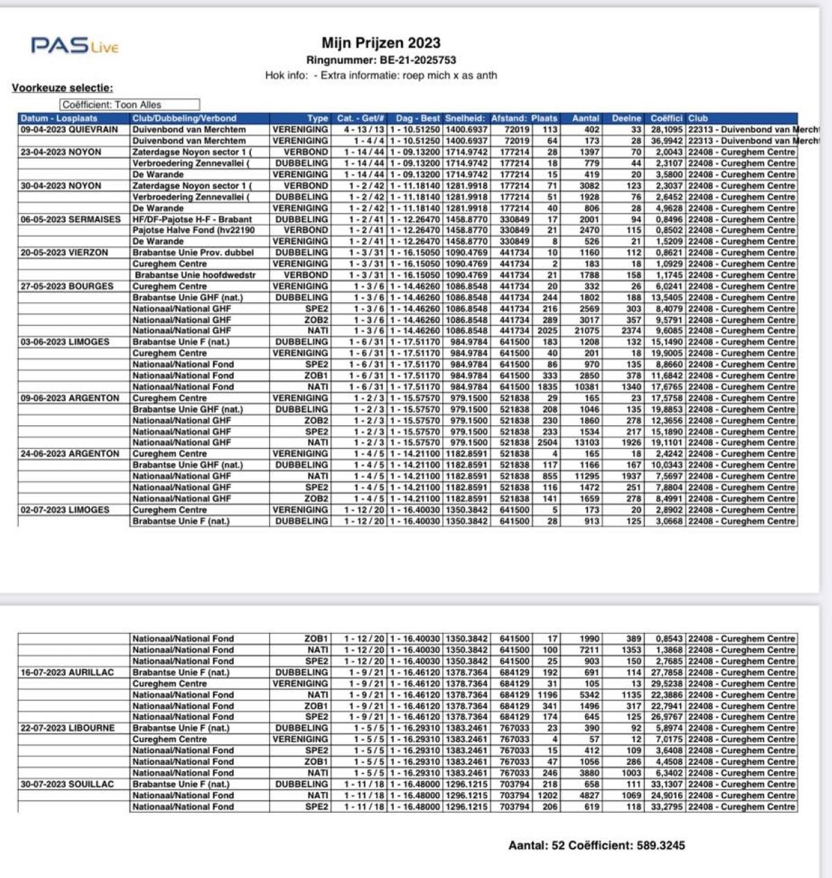 Totaal aantal duiven: 3037 - Laatste update: 06/06/2024 09:39 - Winner: Noeyens Niels & Quinten