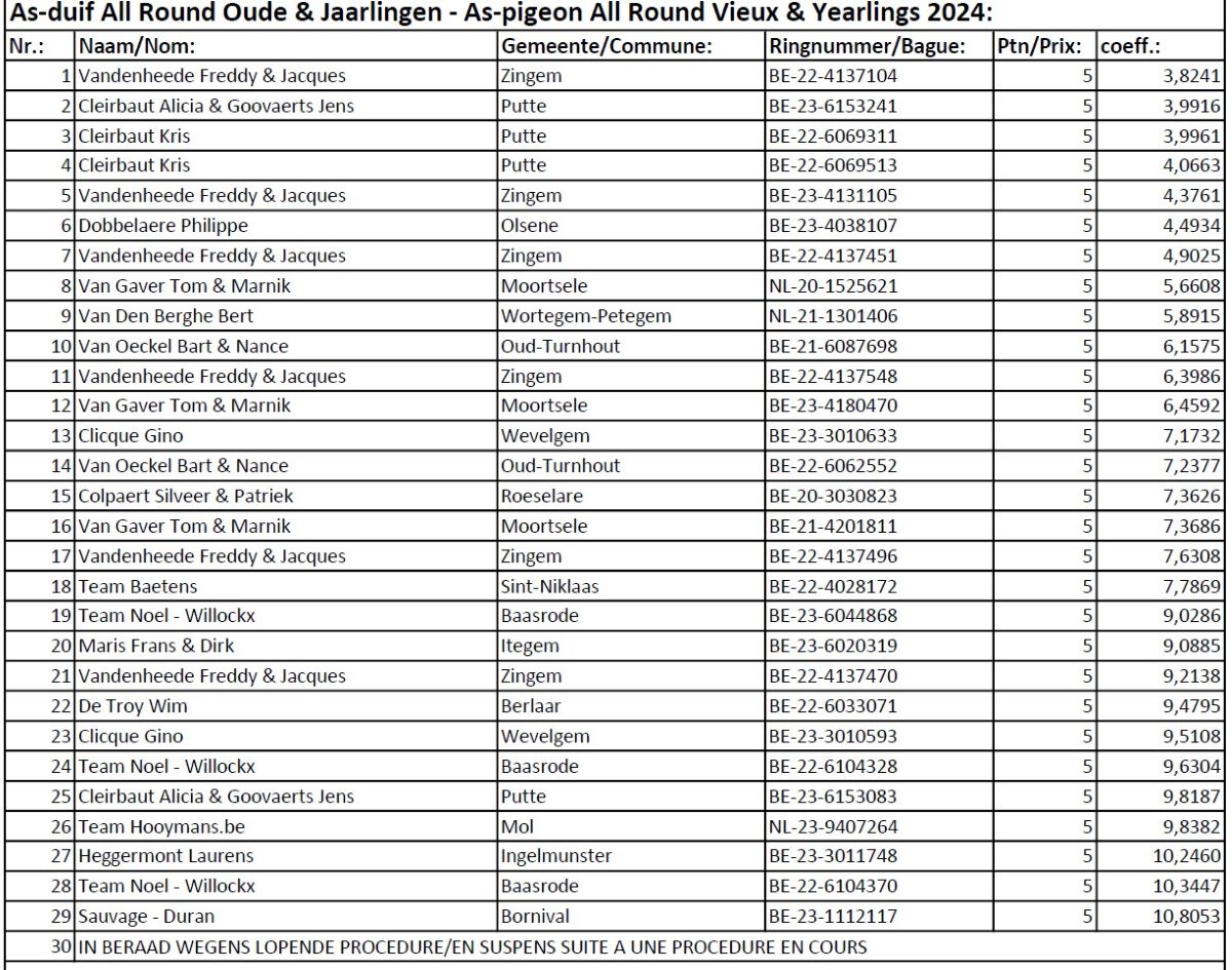 - 7-9e NAT Argenton I 2024 (08/06/2024) België (Jaarse) 17.666 & 4-5-9e ZONE Argenton I 2024 (08/06/2024) Zone B3 (Jaarse) 2.178 & 6-8e PROV Argenton I 2024 (08/06/2024) PE Antwerpen (Jaarse) 3.875 & 1-2-4-5-6-6-8-9e Argenton 8/06/24 TURNHOUTSE FONDVRIENDEN (650 ja)