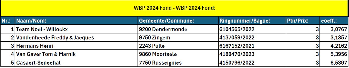 - 9e NAT Bourges I 2024 (25/05/2024) België (Jaarse) 18.785 & 1e ZONE Bourges I 2024 (25/05/2024) Zone B3 (Jaarse) 2.272 & 3e PR Bourges I 2024 (25/05/2024) PE Antwerpen (Jaarse) 3.873& 1-4-6-7-8-9e Bourges 25/05/24 TURNHOUTSE FONDVRIENDEN (564 ja)