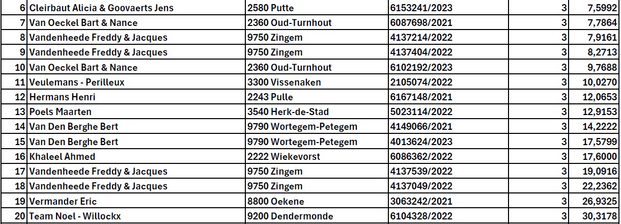 - 5e NAT Souillac 2024 (14/07/2024) België (Oude) 4.673 & 1-5-6e ZONE Souillac 2024 (14/07/2024) Zone B2 (Oude) 953 & 1-3-6e PROV Souillac 2024 (14/07/2024) PE Antwerpen (Oude) 383 & 1-2-3e Souillac 14/07/24 TURNHOUTSE FONDVRIENDEN (66 ou)