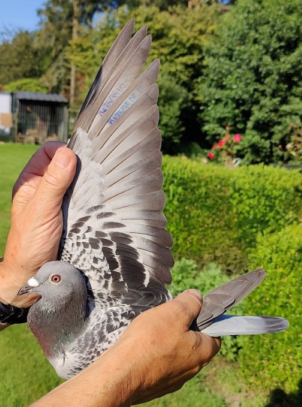 De geschelpte duivin met ringnummer BE23-6062163 'Mustang Magic' wint