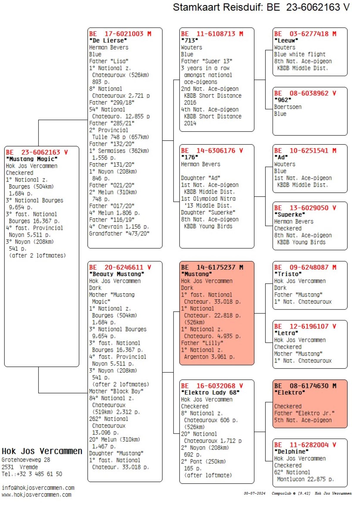 De BE23-6062163 'Mustang Magic' is een kleindochter van 'Mustang' (BE14-6175237). Ze won als jonge duif al 4° snelste Provinciaal Noyon (208km) 5.511 duiven op een loodzware en loodzware vlucht.
