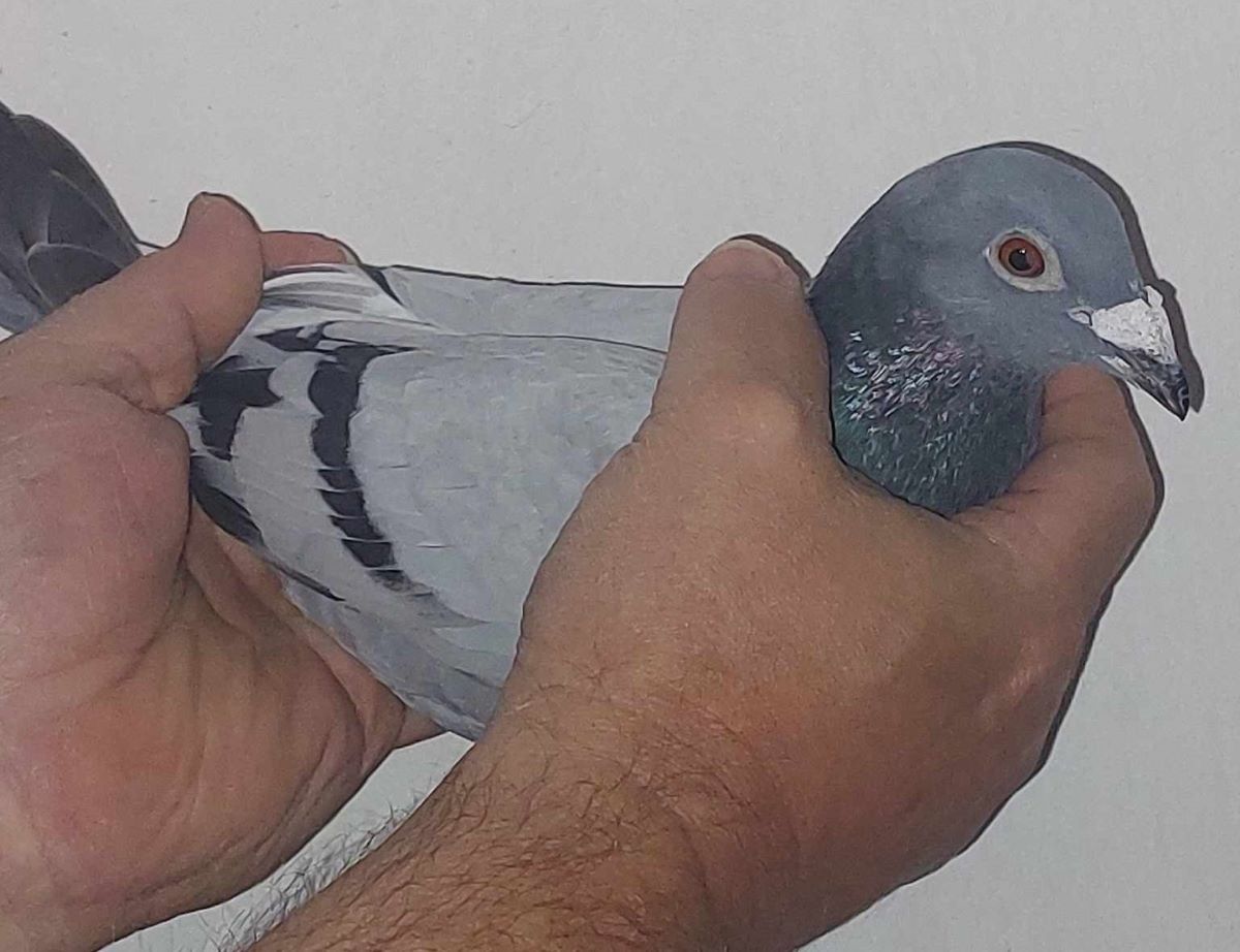 De blauwe jonge duif met ringnummer BE24-3020541 'Turbo Nick' wint