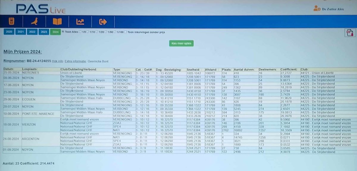 Totaal aantal duiven: 3021 - Laatste update: 03/09/2024 14:01 - Winner: De Zutter Alex