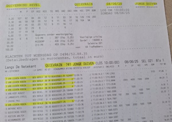 LANGS DE NETEKANT JONGE DUIVEN, QUIEVRAIN op 08/06/25. Los om 10:00:00. 741 duiven. (44 liefhebbers)