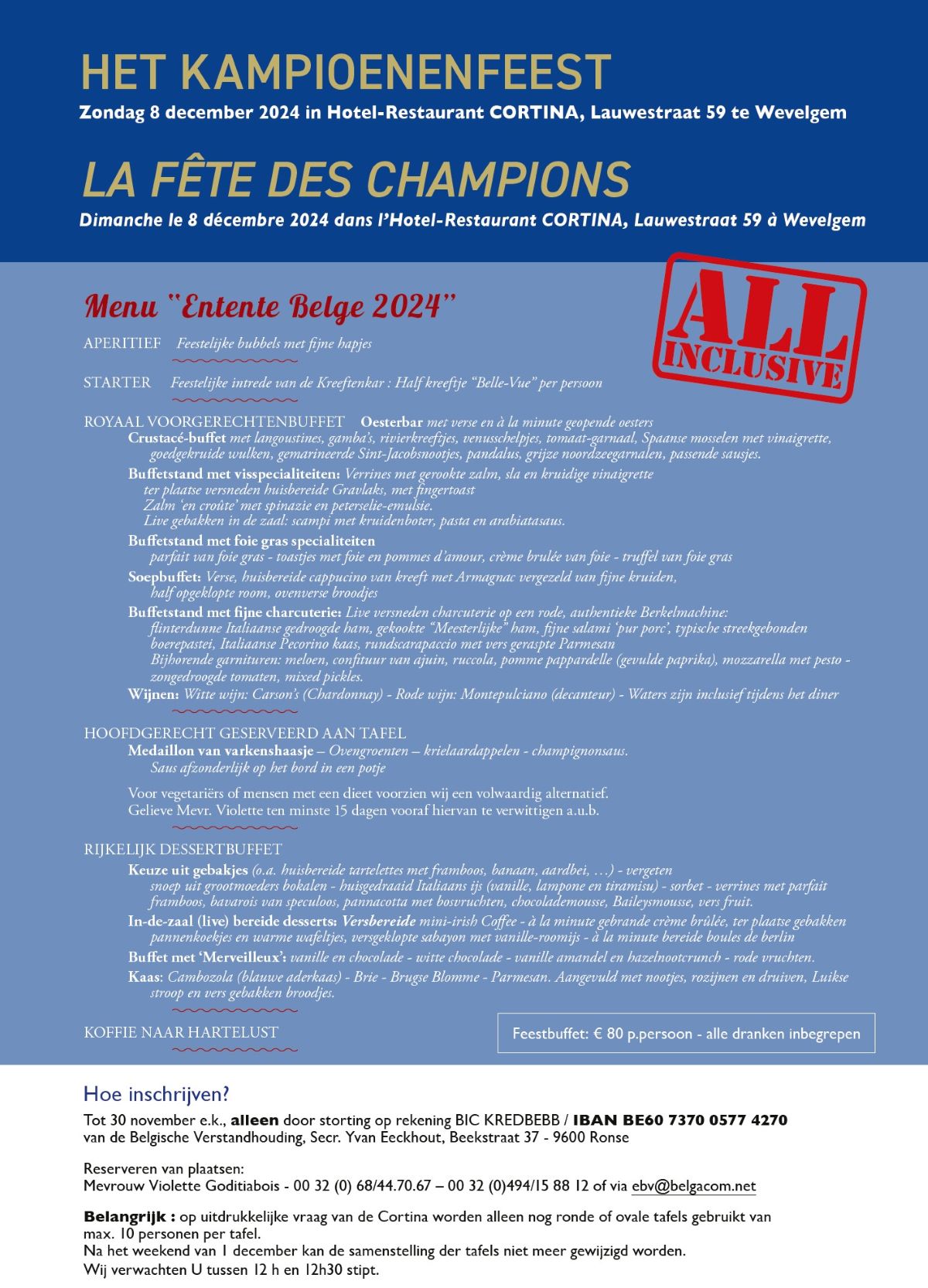 HET KAMPIOENENFEEST VAN DE BELGISCHEVERSTANDHOUDING heeft plaats op ZONDAG 8 december 2024 in Hotel - Restaurant ‘CORTINA’ Lauwestraat 59 te Wevelgem
