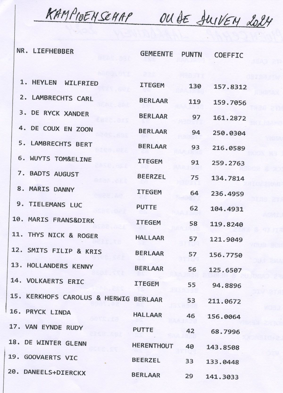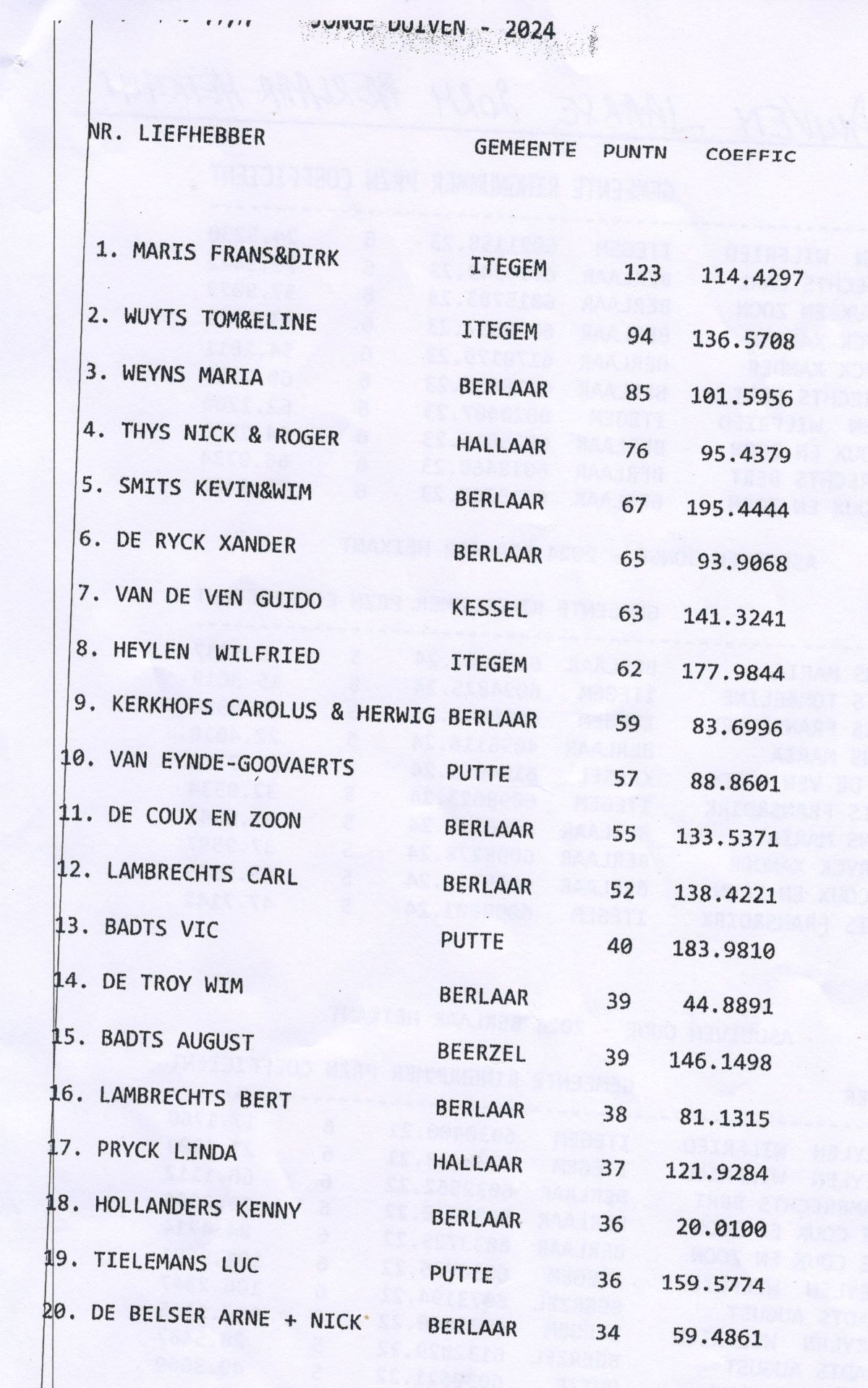 Klik hier voor BERLAARSE HAFO VRIENDENKRING Kampioenschappen 2024 Jaarse duiven Hafo