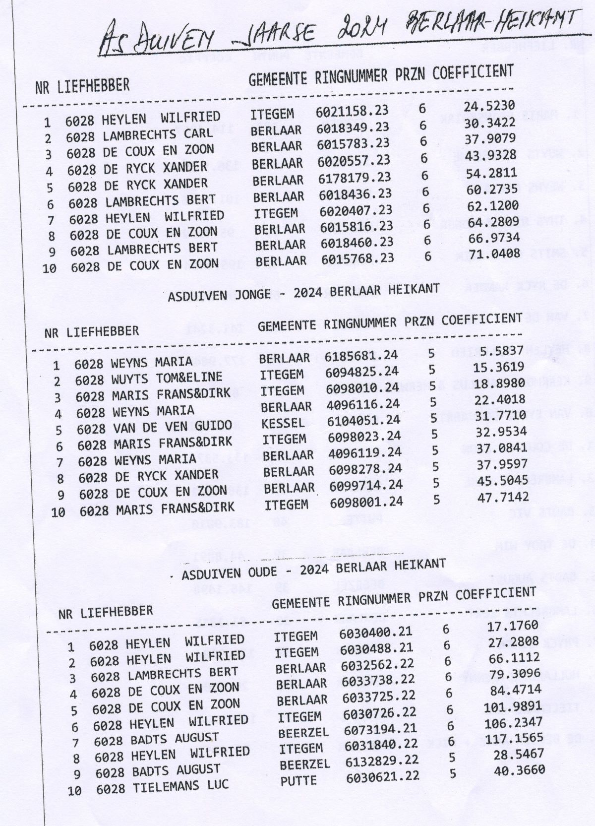 Klik hier voor BERLAARSE HAFO VRIENDENKRING Kampioenschappen 2024  Jaarse duiven Hafo