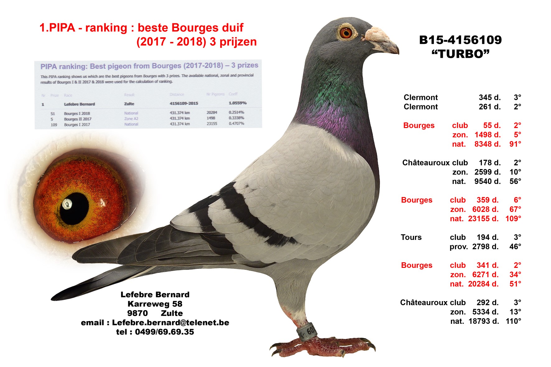 In de seizoenen 2017-2018 maakte zijn “Turbo” furore op de nationale vluchten en dan vooral vanuit Bourges. Zo werd “Turbo” 1e Asduif Bourges PIPA Rankings 3 prijzen seizoenen ’17-’18.